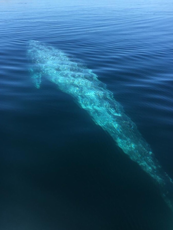 Nous nous rapprochons, guettant l’expiration caractéristique de ces géants marins. Deux souffles magistraux plus loin, nous sommes à quelques encablures de la bête. L’excitation monte. Ça y est, la baleine, douze mètres de long, nage maintenant à côté du bateau. Les nombreuses tâches blanches qui ornent son corps fuselé la rende facilement visible sous la surface. Soudain, avec une grâce inouïe, elle fait surface, nous arrose de son jet, s’incline légèrement sur le flanc, et sonde doucement, notre regard glissant de sa tête en triangle à sa majestueuse et immense queue. Tout cela à moins de deux mètres de l’embarcation. Je suis saisi par la magie de l’instant, et submergé d’émotion. Me reviennent en mémoire les images d’un panneau de papier canson, sur lequel sont collées des images découpées dans un numéro d’Image Doc. J’ai huit ans, et je présente devant la classe de CE2 de Madame Piot un exposé sur les baleines à bosses. Le regard perdu dans les eaux de la baie, les jambes tremblant légèrement, je ne peux retenir une petite larme. La magie semble avoir opéré aussi chez mes compères, dont les visage ne se déparent pas d’un sourire hagard.