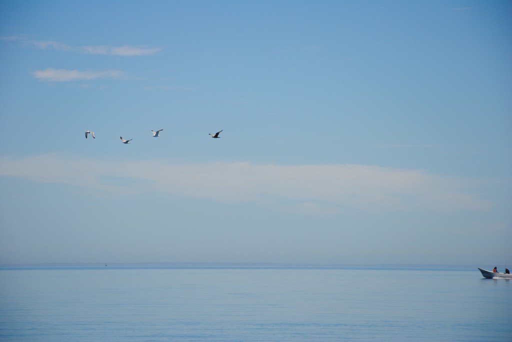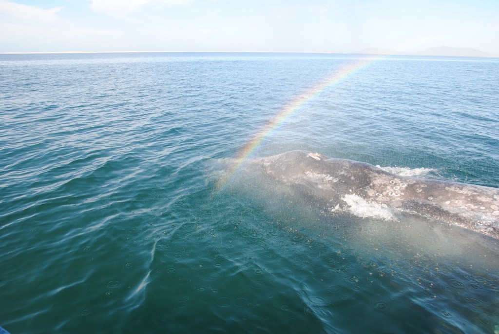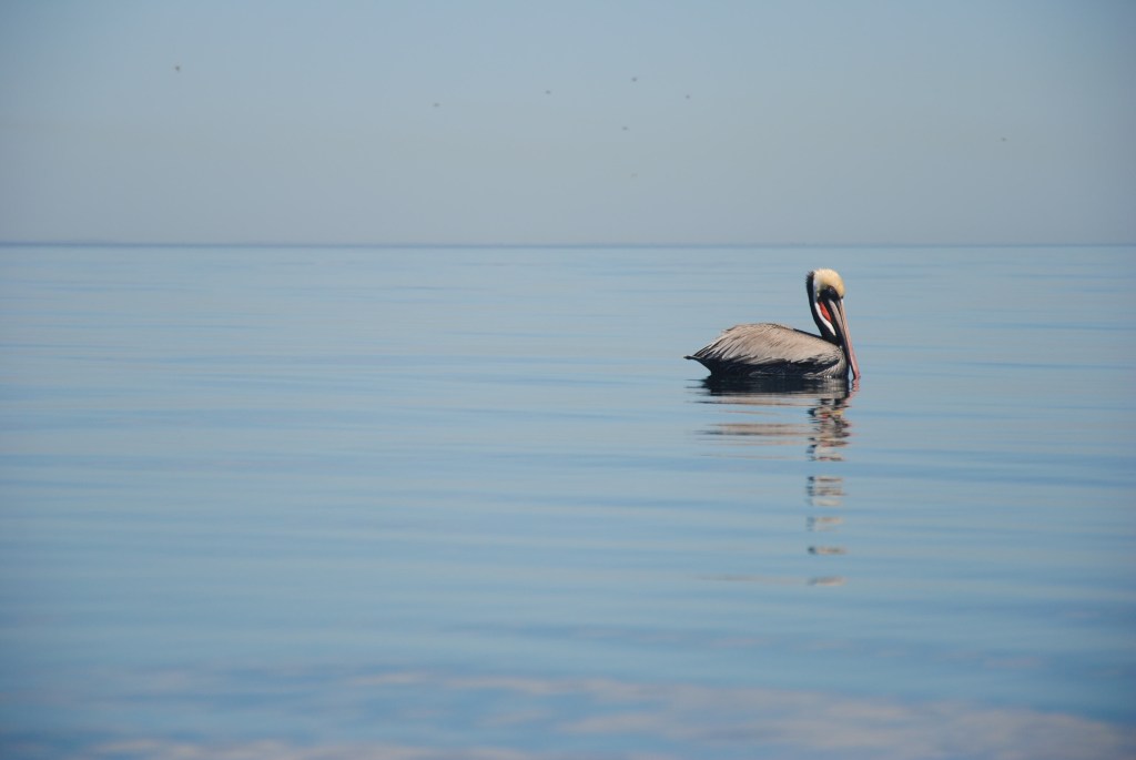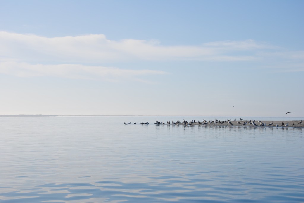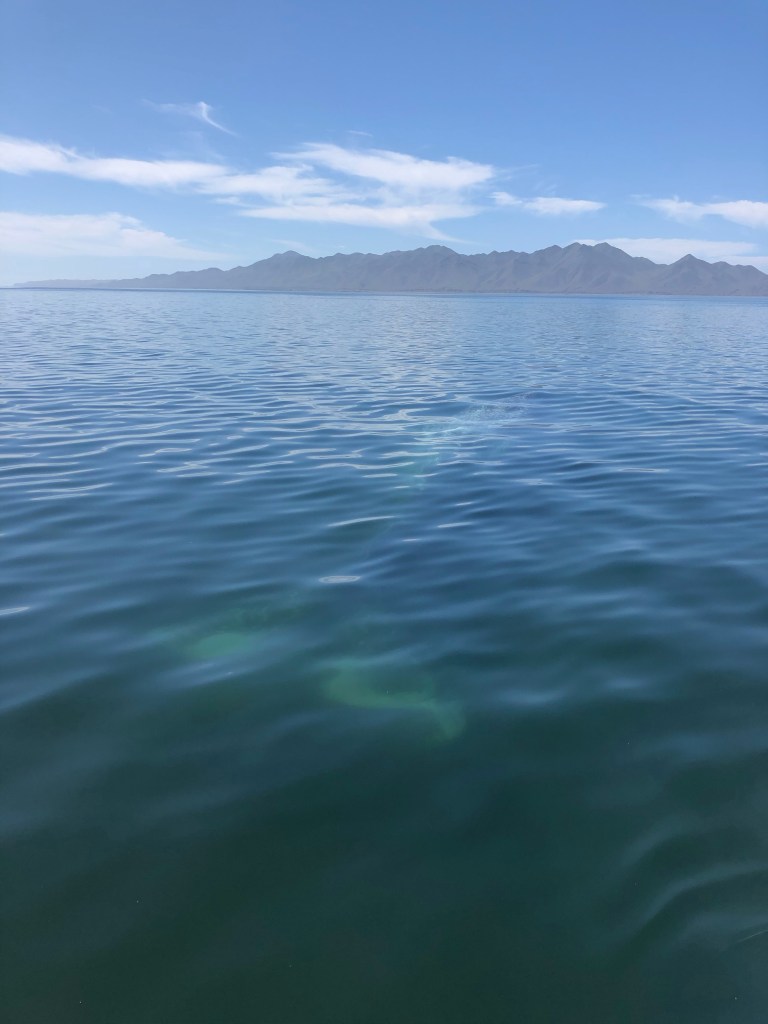 Outre les baleines grises, le paysage est fantastique ! La baie est fermée par des îlots étroits de montagnes brunes qui cisèlent l’horizon. La couleur de l’océan varie au gré des heures qui défilent doucement. Les oiseaux marins suivent des courbes aléatoires dont le tracé possède à coup sûr un dessein qui nous échappe.