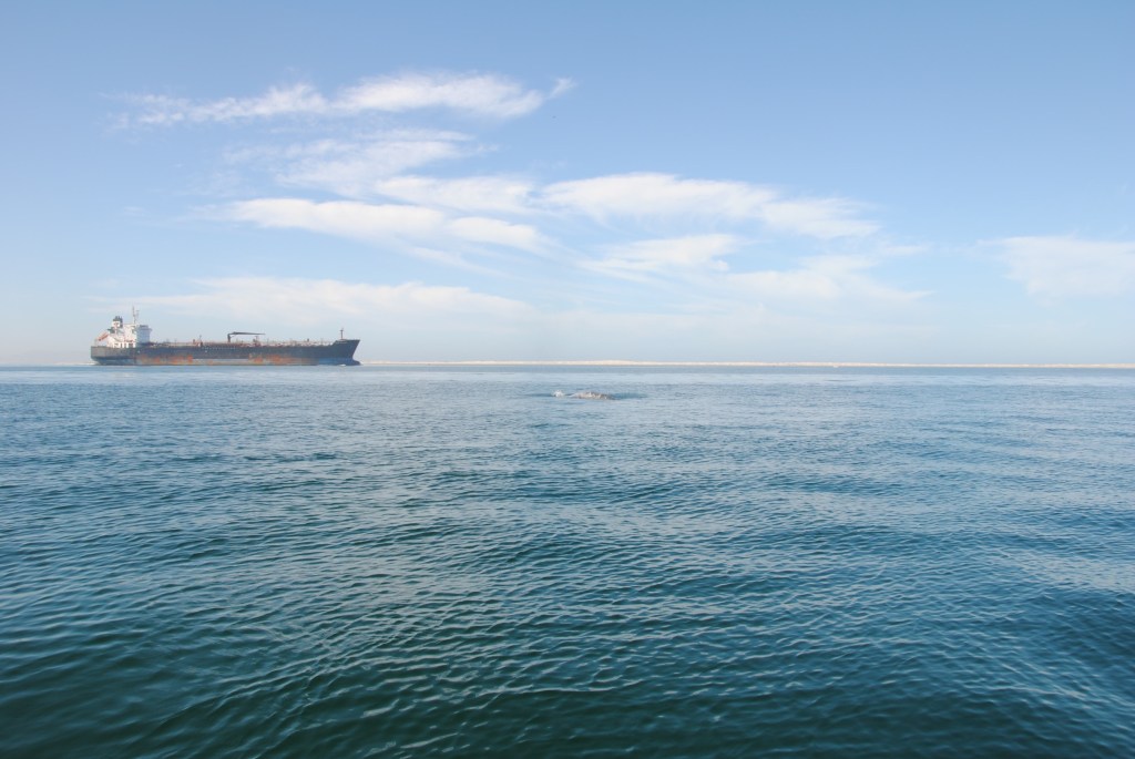 Nous ne tardons pas à apercevoir notre première baleine, qui fait surface au loin, devant un gros cargo rouillé.