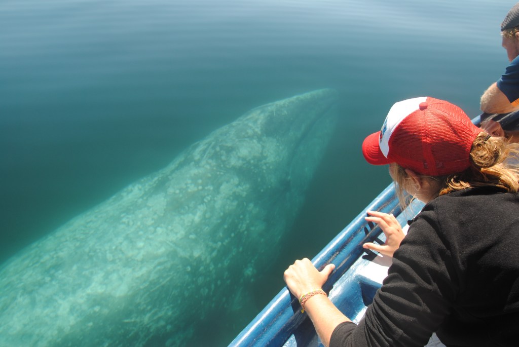 Capitaine Miguel fait ensuite cap vers l’Ouest de la baie, et nous voguons longtemps, admirant le superbe paysage, avant de trouver notre second spécimen. À l’issu de la même danse d’approche, au gré des jets arc-en-ciel expulsés des evens de la bête, nous partageons un long moment de nage commune avec une baleine encore plus imposante que Madeleine. Lors d’une de ses nombreuses remontées, la bête, penchée sur le flanc s’approche si près du bateau que nous pouvons la caresser à loisir. Quelles sensations extraordinaires ! Sa peau est à la fois soyeuse et rugueuse. Et ce regard…Ce petit œil mobile d’une infinie douceur, miroir mystique, reflet du fond des âges.