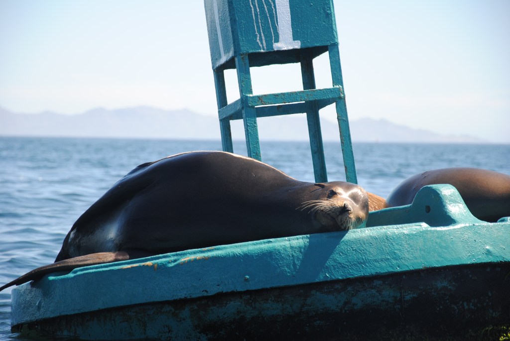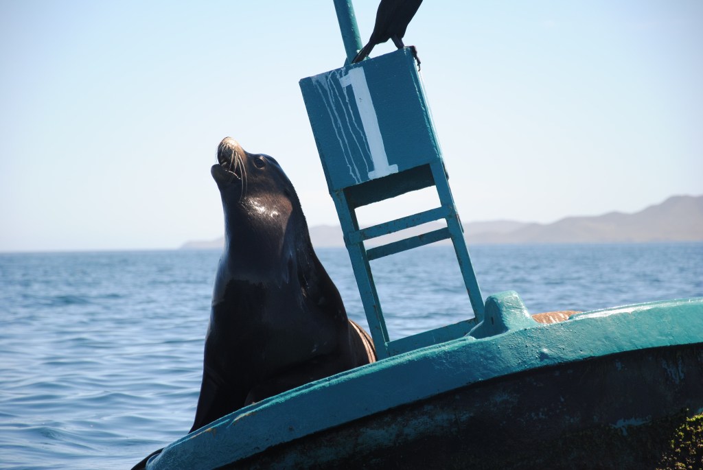 Nous trouvons ensuite, alors que nous commençons à nous rapprocher de San Carlos, une famille de lions de mer allongée sur une bouée au milieu de l’océan. Le père de famille, sorte de Al Bundy des mers, prend toute la place sur l’étroit canapé flottant, précipitant parfois les femelles à l’eau.
