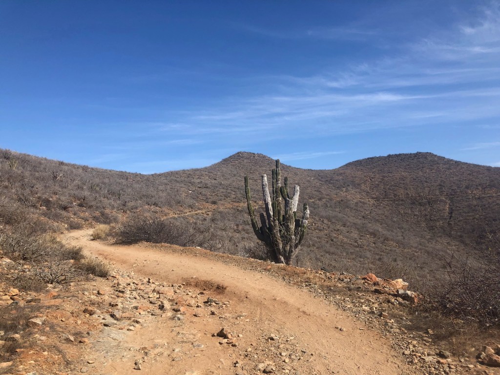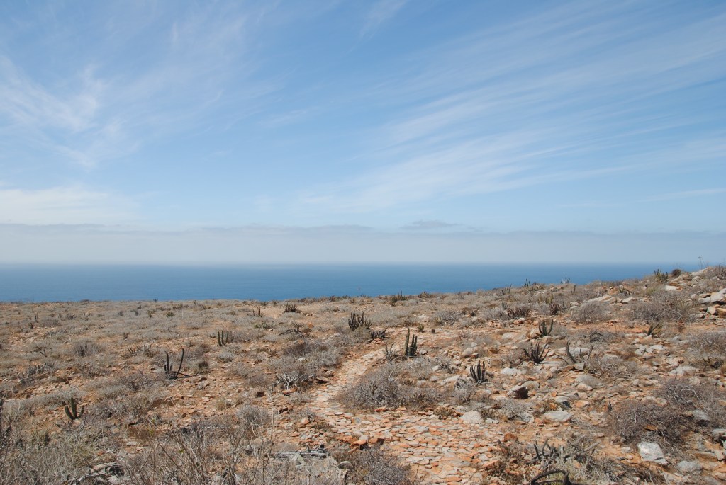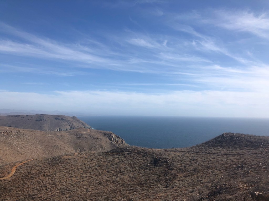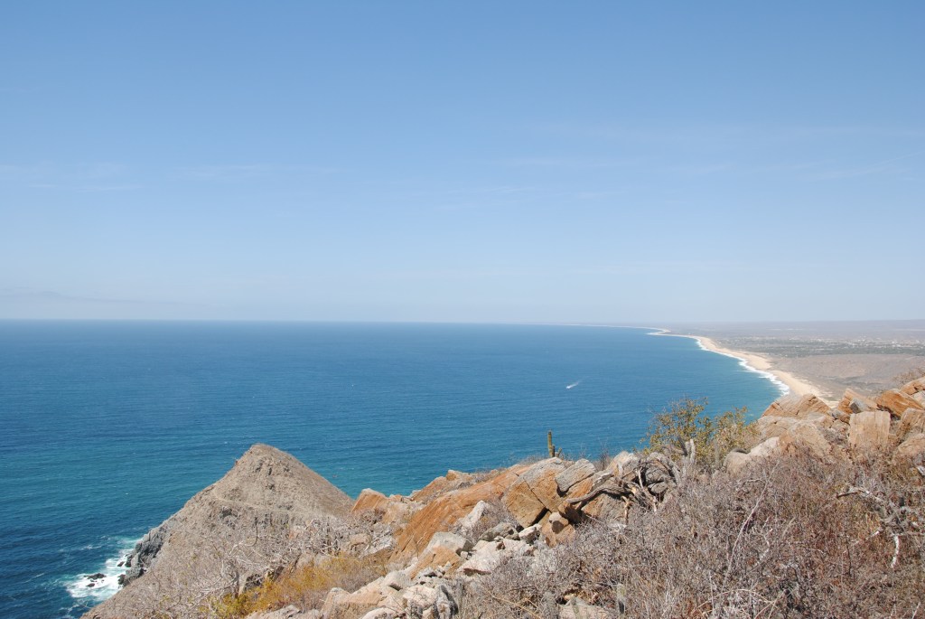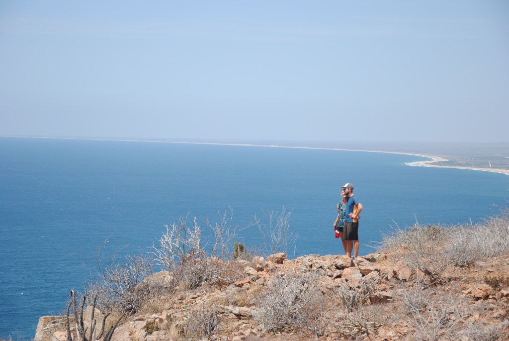 De retour à l’auberge, chacun vaque à ses occupations, au cours d’une après-midi « libre ». Je choisis d’aller découvrir les collines désertiques des environs au pas de course. Une route de sable me mène jusqu’à la Punta Lobos, au bout de la plage sur laquelle nous avions assisté au ballet des baleines devant le soleil couchant. Puis j’emprunte un sentier qui grimpe entre deux collines, pour rejoindre le sommet de la montagne qui domine la pointe. Le paysage est lunaire ! Cactus, agaves, et arbustes courts et secs parsèment une terre caillouteuse, grise, orange et ocre. En contrebas, l’océan pacifique, bleu, froid, et agité, marque un contraste saisissant avec le sable jaune et les terres marrons qui le prolongent. À l’est, le désert brun, boursouflé de buttes arrondies, court jusqu’à la Sierra de la Laguna, dont les contreforts dépassent les mille mètres. Assis sur un rocher surplombant la baie, je reste un long moment à contempler cet univers antagoniste, où l’eau rencontre le feu, le froid le chaud, la mort la vie.