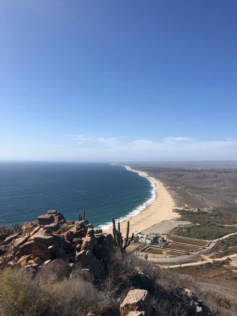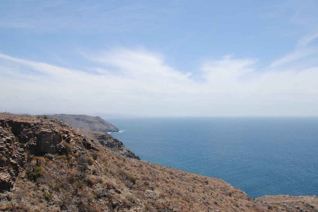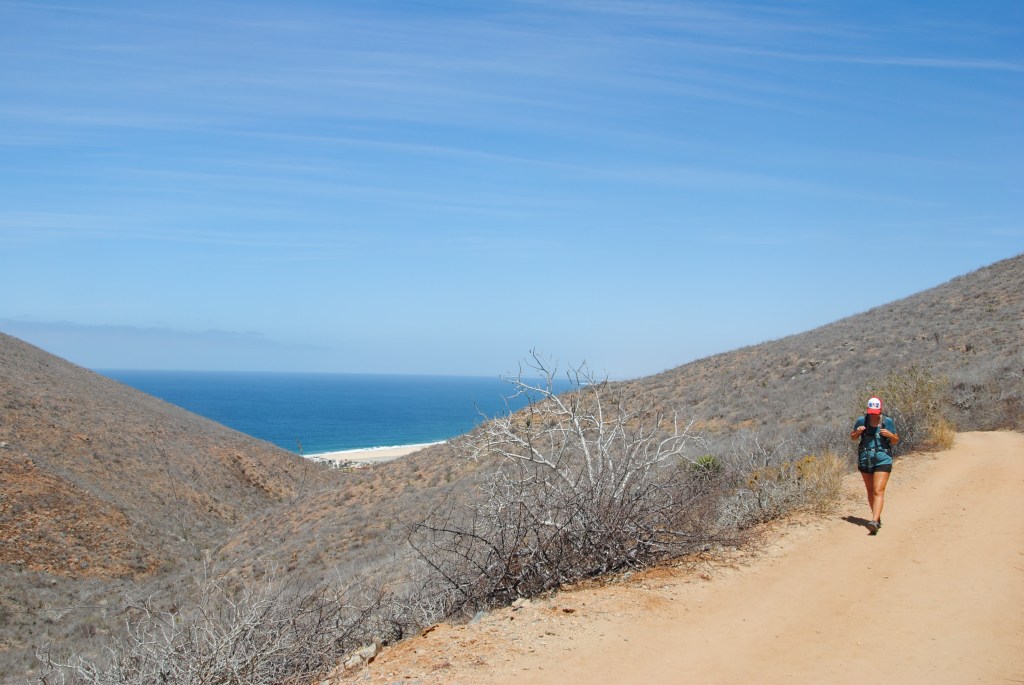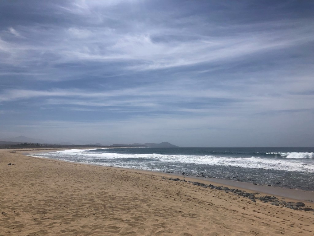De retour à l’auberge, chacun vaque à ses occupations, au cours d’une après-midi « libre ». Je choisis d’aller découvrir les collines désertiques des environs au pas de course. Une route de sable me mène jusqu’à la Punta Lobos, au bout de la plage sur laquelle nous avions assisté au ballet des baleines devant le soleil couchant. Puis j’emprunte un sentier qui grimpe entre deux collines, pour rejoindre le sommet de la montagne qui domine la pointe. Le paysage est lunaire ! Cactus, agaves, et arbustes courts et secs parsèment une terre caillouteuse, grise, orange et ocre. En contrebas, l’océan pacifique, bleu, froid, et agité, marque un contraste saisissant avec le sable jaune et les terres marrons qui le prolongent. À l’est, le désert brun, boursouflé de buttes arrondies, court jusqu’à la Sierra de la Laguna, dont les contreforts dépassent les mille mètres. Assis sur un rocher surplombant la baie, je reste un long moment à contempler cet univers antagoniste, où l’eau rencontre le feu, le froid le chaud, la mort la vie.