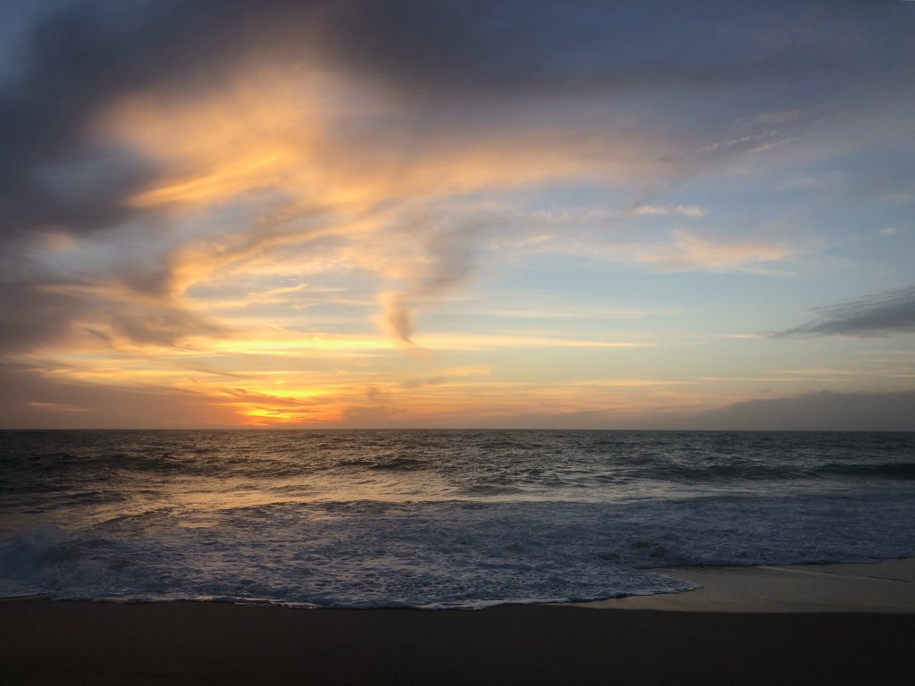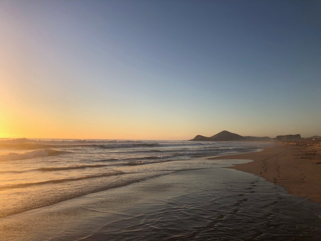 La plage est magnifique, sauvage, et la Punta Lobos, au Sud, avec ses montagnes bosselées, ferme superbement la baie. Nous arpentons le sable souple, en regardant le soleil baisser. C’est alors qu’Aurélien aperçoit un puissant jet d’eau, à moins de vingt mètres du rivage. Une baleine ! Nous sommes abasourdis de la voir si près du bord. Une telle masse dans si peu d’eau ! D’abord inquiets, nous sommes rassurés de la voir émerger ici et là, se mouvant sans encombre entre les vagues puissantes. Le ciel se pare d’orange alors que le soleil entame son coucher. Et le spectacle continue…Dans l’axe de l’astre fauve, au loin, de grandes gerbes d’eau…Des baleines sautent devant le soleil, pour notre plus grand plaisir ! Les couleurs sont incroyables, et, sur le chemin du retour, émus, nous n’en revenons pas d’avoir assisté à une telle explosion de beauté.