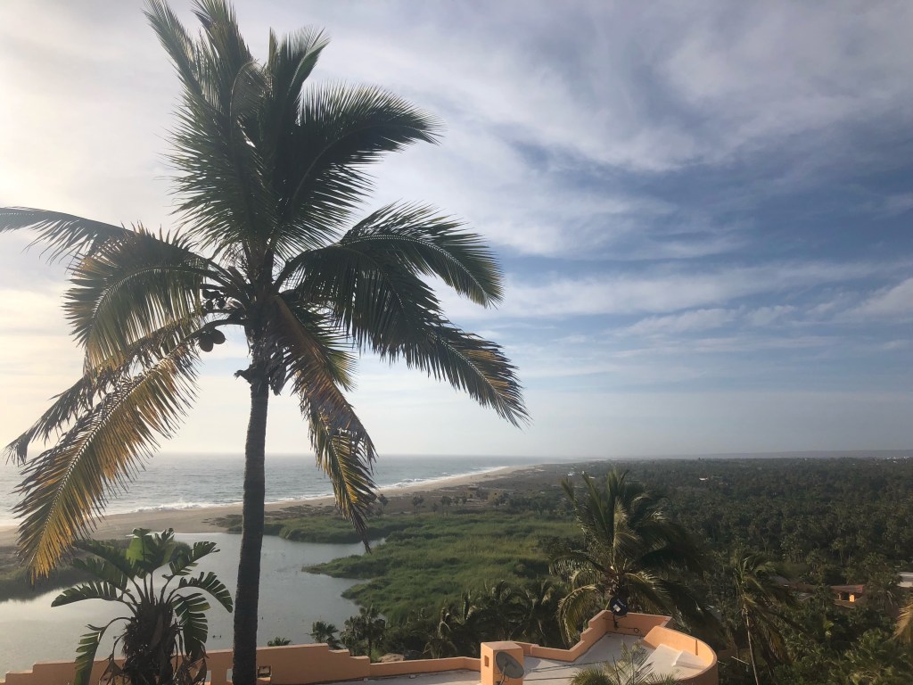 L’après-midi se poursuit par un long moment de détente à l’auberge, à travailler sur nos blogs respectifs. Reposés, nous marchons ensuite vers la plage attenante au village, dernière une petite butte marron. Du haut de la colline, nous réalisons que Todos Santos est posé au bord d’une grande oasis, une longue palmeraie se fraie un chemin jusqu’à la mer, séparée d’elle par une petite lagune en forme de croissant de lune.