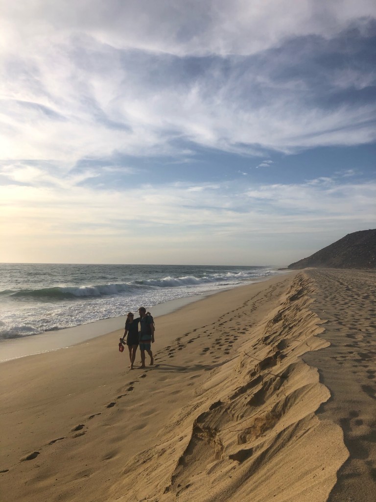 Une fois lassé des claques de l’océan, j’abandonne ma planche et m’assoie sur le sable, regardant la mer dans un demi-sommeil. Fatigués eux aussi, Julie et Aurélien me rejoignent, et nous rentrons vers Todos Santos, les narines pleines d’eau et les oreilles de sable.