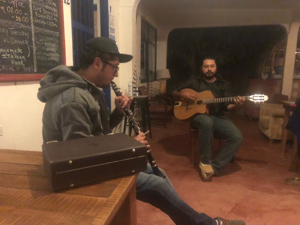 Enivrés par ces images, nous prolongeons l’ivresse par un petit verre de mescal, que nous sirotons en préparant à dîner. La conversation s’anime et la tablée s’agrandit. Nous sommes rejoins par Katarina et Ricardo, mes colocataires, Sven, un professeur d’espagnol allemand et surfer à ses heures, Jess, qui nous vante les mérites de son Tijuana natal, et Sergio, le jovial manager des lieux. Pour clôturer cette splendide journée, alors que nous nous apprêtons à aller nous coucher, arrivent Carlos et José. Fraîchement revenus d’un concert en ville, ils ressortent guitare et clarinette pour une jam session improvisée. La musique, belle et douce, est un parfait préambule au sommeil, et je m’endors bien vite, le son de la clarinette se muant en chant de baleine…