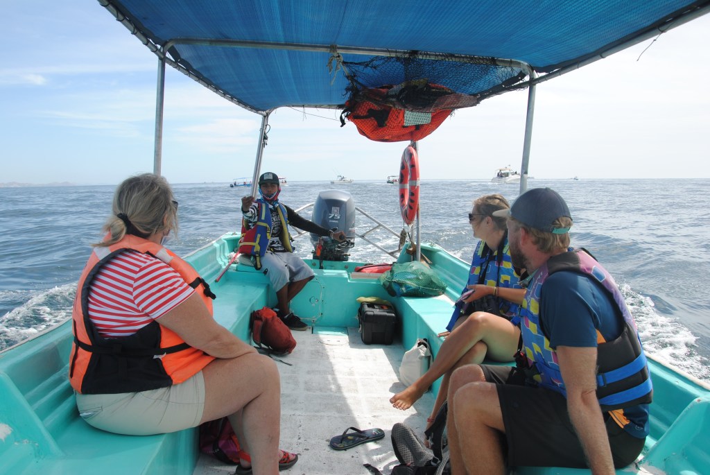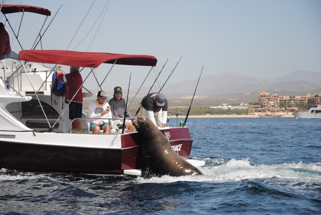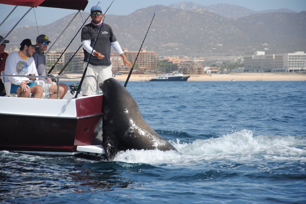 Juste avant l’entrée du port, nous sommes témoins d’une scène ahurissante : un gigantesque lion de mer nage dans le sillon d’un bateau de pêche, alléché par l’odeur du poisson. Il finit par hisser son énorme corps sur la plate-forme arrière de l’embarcation, et dévorer la pêche à même la main des touristes ! Greg nous apprend que « Pepe » est la mascotte de Cabo San Luca, et que « El gordo » est coutumier de cet incroyable fait…