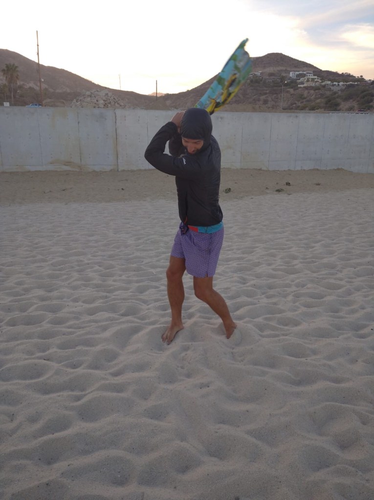 De retour à l’hôtel, courte pause pour nous remettre de cette matinée belle et bien remplie. Puis nous repartons vers la playa Costa Azul, spot de surf plus à l’est repéré par Aurélien. Avec son enthousiasme habituel, il se lance dans l’eau fraîche, à la conquête des vagues. Une légère fatigue, ainsi que le sol caillouteux ont raison de ma motivation, et je préfère rester sur la plage, à écrire et regarder la mer. La fin du jour emplit l’air marin de fraîcheur, et c’est dans le désormais traditionnel accoutrement « doudoune – maillot » que nous attendons la sortie des flots de notre ami surfer.