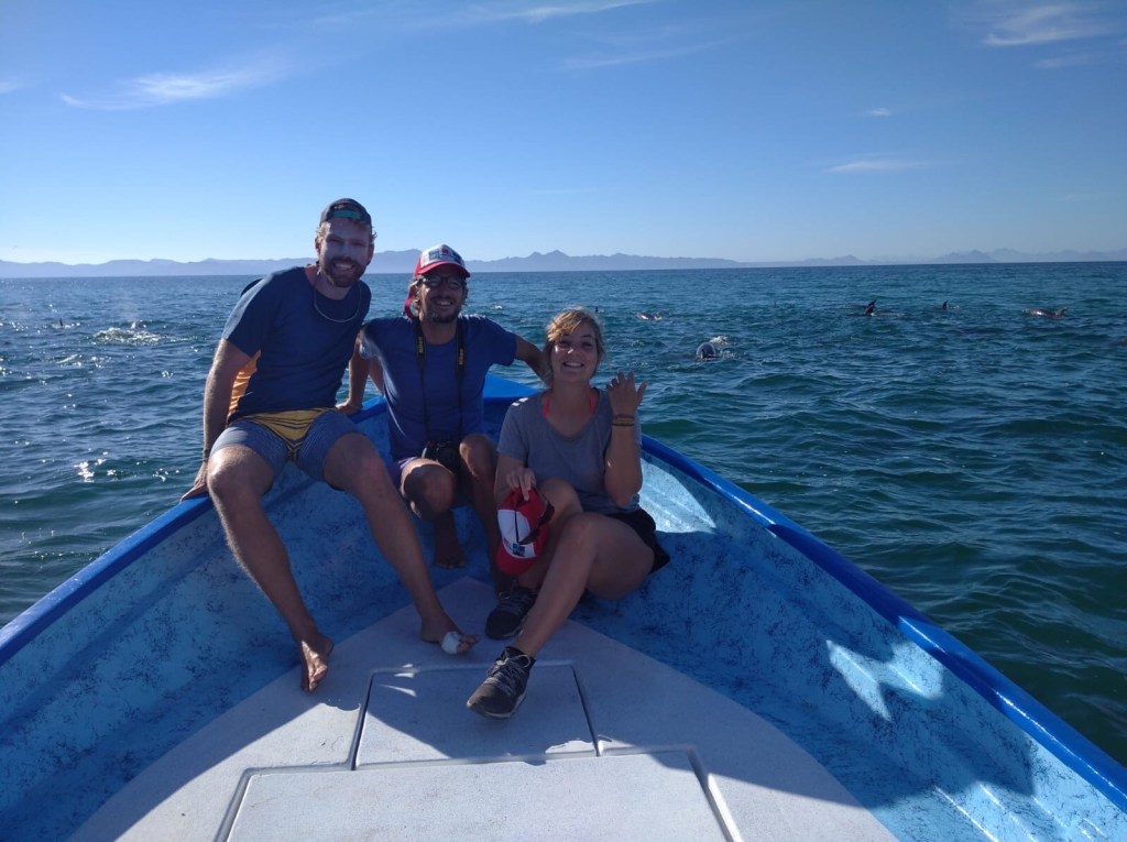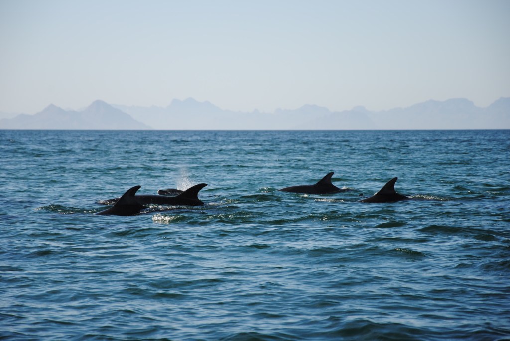 Joueurs, certains se rapprochent du bateau et longent l’embarcation, avant de s’éloigner par un simple mouvement de nageoire, efficace et gracile. Je jurerai que l’un de ces espiègles spécimens, au moment de vriller, m’a fait un clin d’œil ! Les dauphins vont et viennent, formant de larges cercles pour emprisonner leurs proies. Nous les accompagnons près d’une demi-heure, émerveillés par ce documentaire animalier en direct, dans le magnifique théâtre de la Bahia Loreto.