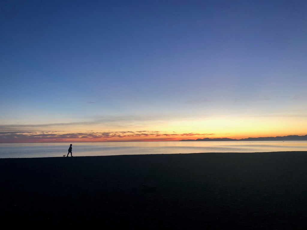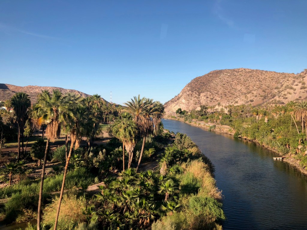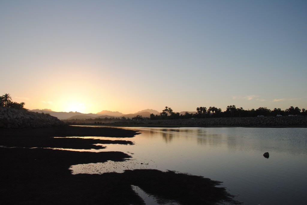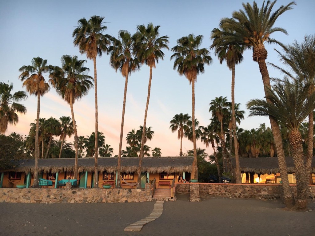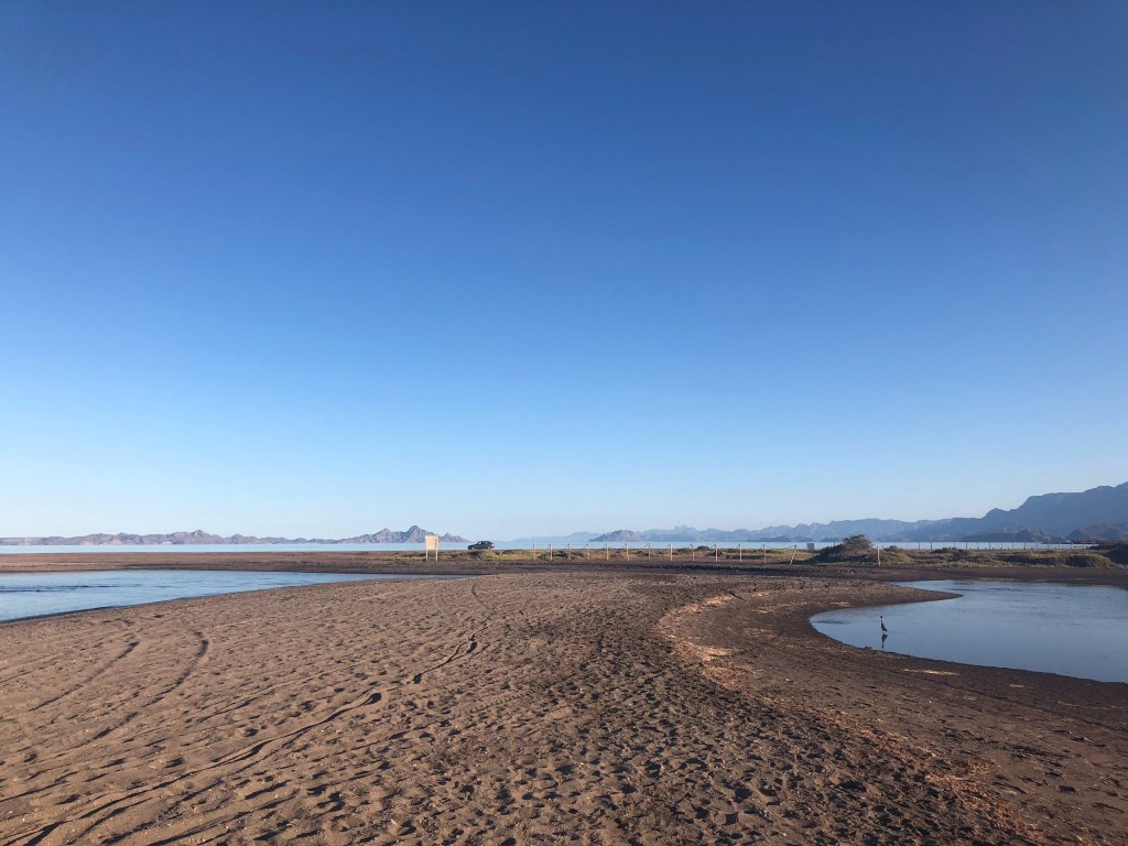 Au bout du Malecón, au sud, directement sur la plage, se trouve l’hôtel Oasis. Après un interminable et bureaucratique check-in, nous découvrons notre chambre dans une jolie maison de plein pied, avec vue sur l’isla de Carmen. Assurément un cran au-dessus de nos standards habituels, l’hôtel Oasis promet d’être une maison agréable et confortable pour les deux prochains jours. Une fois installés, nous partons nous balader sur la plage, en direction de l’estuaire de la rivière asséchée qui borde l’oasis. Nous découvrons un paysage extraordinaire : les montagnes brunes, étroites et ciselées des îles et du continent se font face, et se rejoignent presque dans une eau que la fin du jour et l’absence de vent ont rendu laiteuse. Après plus de trois semaines dans la péninsule, la Basse Californie parvient encore à nous surprendre, avec cette nouvelle facette en dents de scie. Quand le désert rencontre les Lofoten…