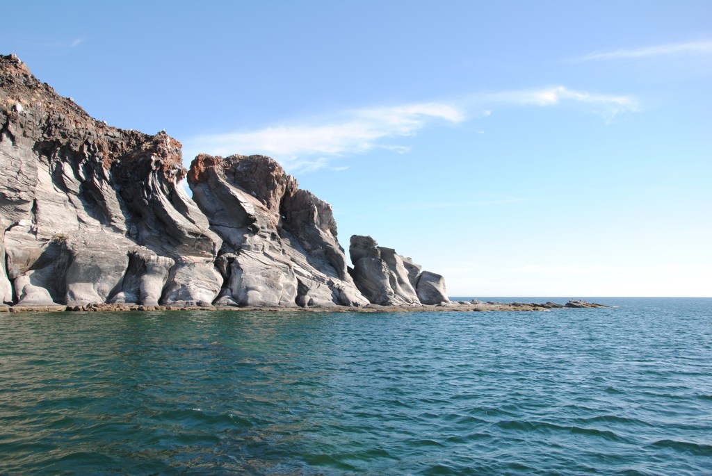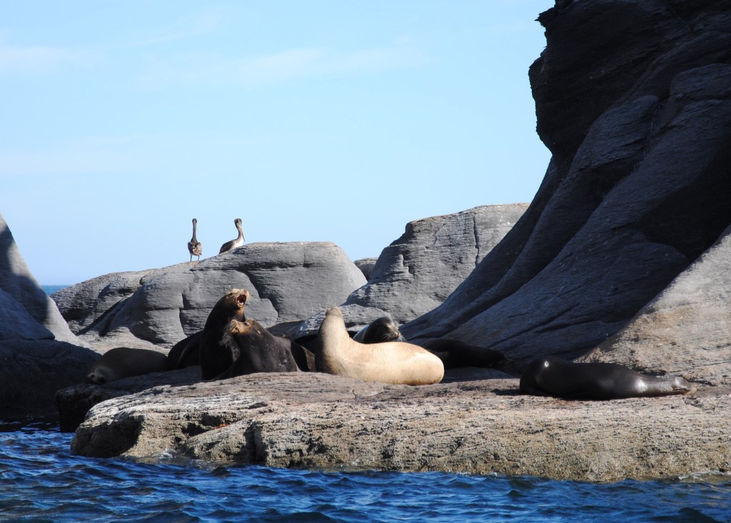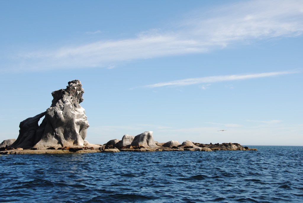 Nous laissons les dauphins à leurs festins et poursuivons notre tour de l’île Coronado. Les formations rocheuses qui dessinent ses contours, sorte d’empilement de grosses pierres grises et lisses mêlées à des roches volcaniques, sont superbes. Sur l’un de ces étroits promontoires, une colonie de lions de mer, nombreuse et odorante, prend le soleil. La présence de nombreux mâles alphas, massifs et agressifs, en cette saison des amours, rend la baignade dangereuse.