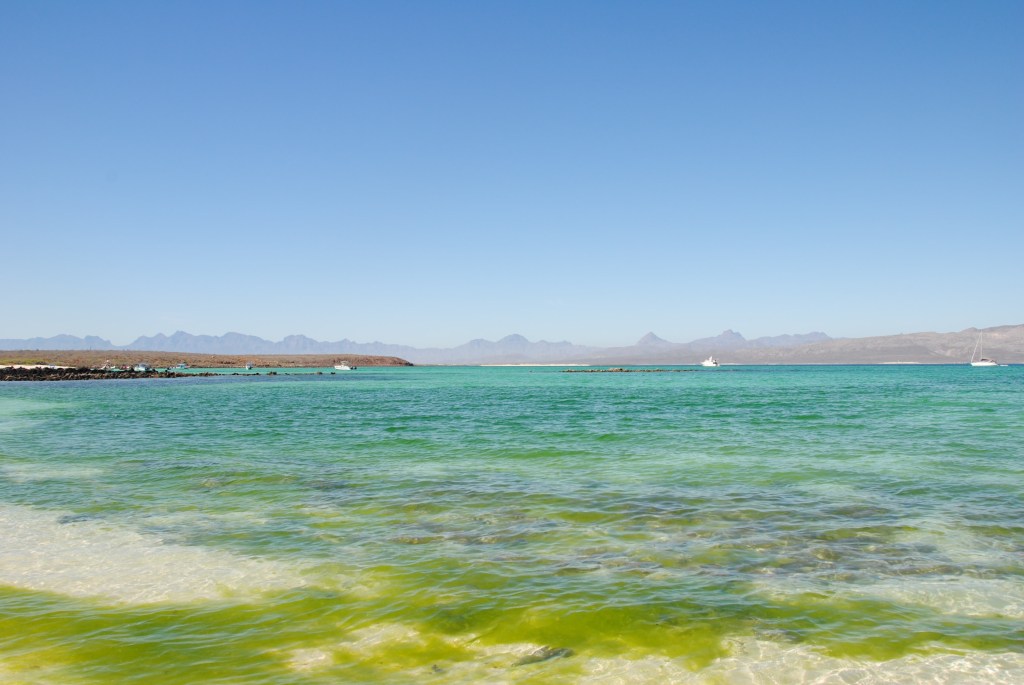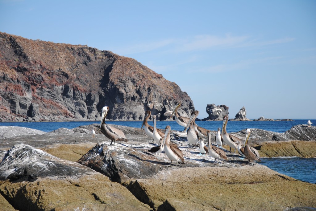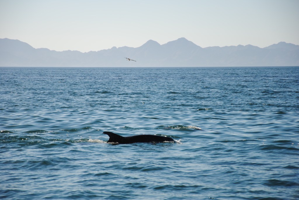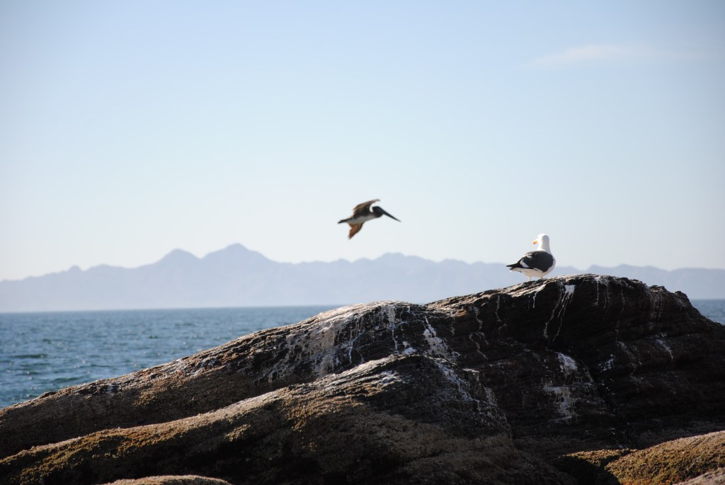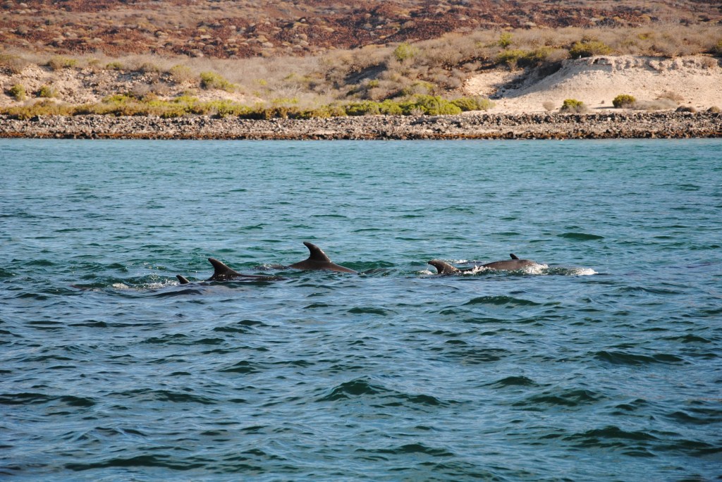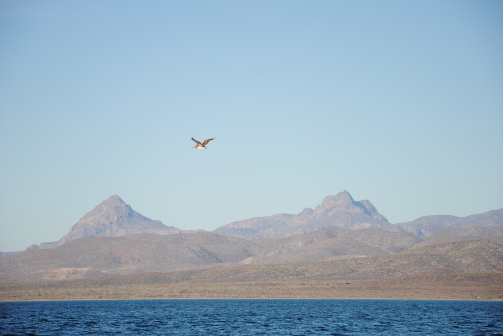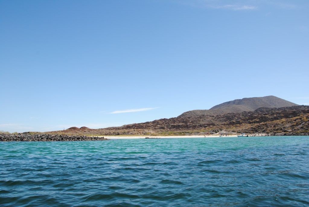 Pour rejoindre notre prochaine étape, nous contournons l’île par le nord, et avons ainsi tout le loisir d’admirer son dôme volcanique, étrange religieuse au café écrasée à sa base. Nous accostons sur une jolie plage, bordée d’arbres secs mais verts. La vue sur la Sierra de la Giganta, qui domine la baie de Loreto est splendide. La mer revêt une palette de verts et de bleus, et quelques mouettes, profitant aussi du paysage, nichent à même le sable. Les eaux peu profondes recèlent moins de richesses que les fonds rocailleux de l’autre côté de l’île, mais quelques poissons anges et une flopée d’étoiles de mer suffisent à notre bonheur. Du rivage, nous apercevons au large un petit groupe de dauphins sautant joyeusement à côté d’un modeste yacht amarré.