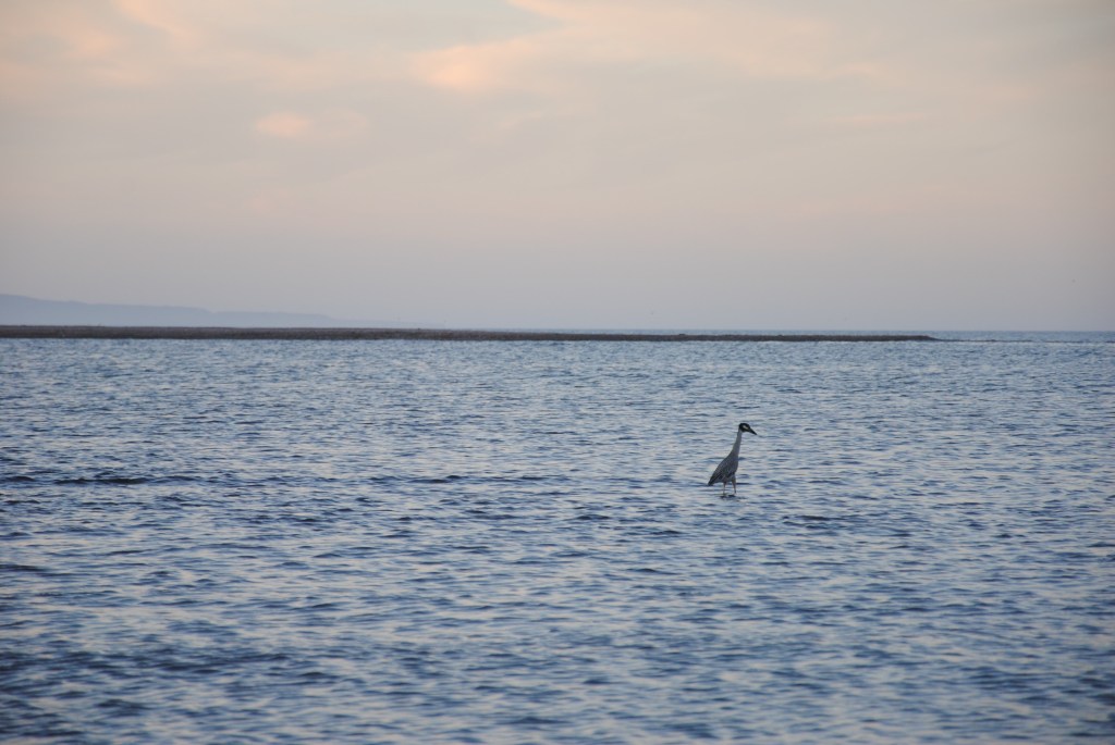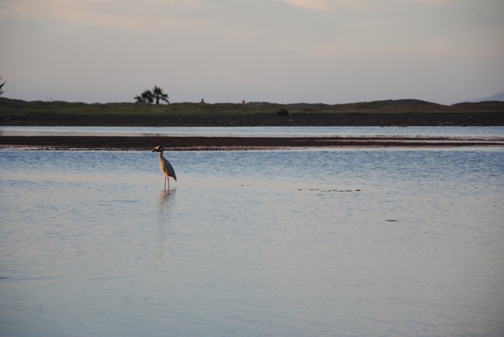 Merveilles capturées dans de très nombreux clichés, ce qui nous vaut une longue séance de tri, qui occupe une bonne partie de l’après-midi. Je parviens tout de même à m’extraire de ma tablette pour lire quelques pages de Darwin, confortablement installé sur la belle terrasse de l’hôtel. Autre miracle de la journée, nos chaussures sont revenues de leur séjour prolongé sur l’île Coronado ! Nous pouvons ainsi partir pour une promenade vers la jetée, qui se poursuit dans les jolies rues du village. Nous revenons par l’estuaire, où nous attend le héron amateur de fruits de mer, en pleine pêche.