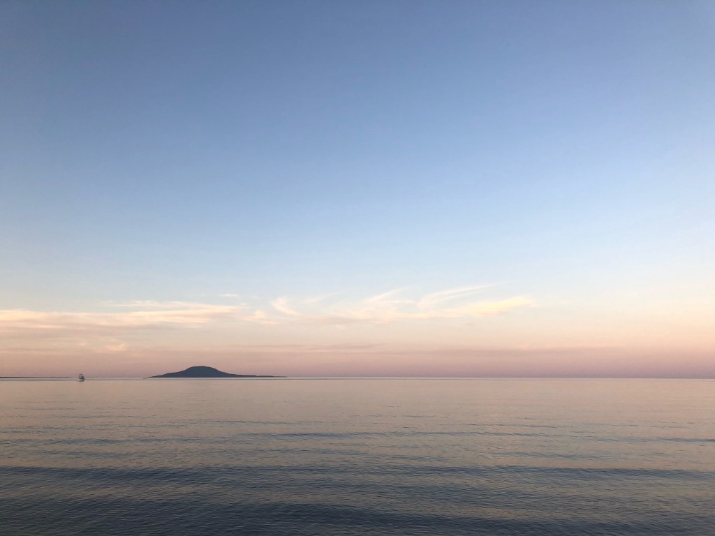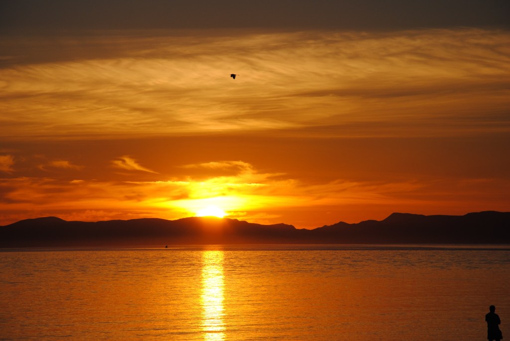 Mardi matin, Loreto. Notre rendez-vous, très matinal, avec le capitaine qui doit nous emmener à l’île Coronado est une aubaine. Il nous permet d’assister à un épatant lever de soleil ! Au dessus d’une mer blanche et lisse, une onctueuse couche de nuages légers, rouge-orangé, dépasse des montagnes ciselées de l’isla de Carmen. Ce spectacle rare me rappelle à quel point j’aime les matins. Eux seuls offrent à nos yeux plissés, les paupières encore lourdes de rêves, la contemplation sereine et égoïste des beautés du monde.