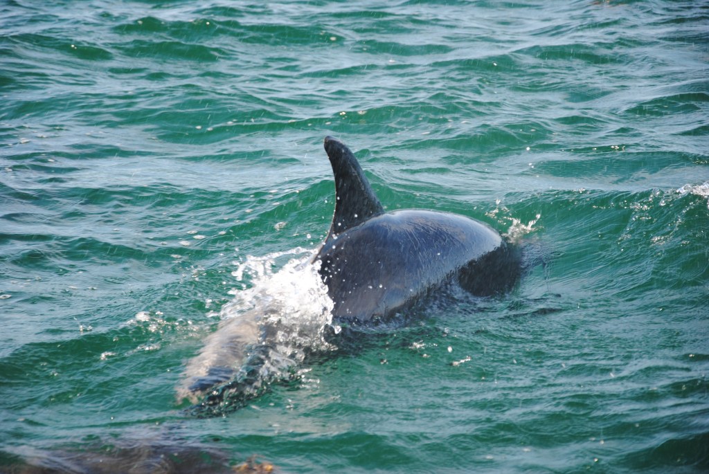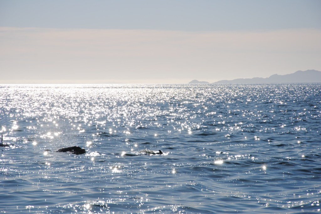 À l’approche de l’île, je devine, au loin, à l’aide de leurs ailerons courbés, la présence de dauphins. A mesure que le bateau avance, le nombre d’ailerons et de petits jets augmente…jusqu’à ce que nous ne soyons plus en mesure de les compter ! Nous sommes en fait pris au milieu d’une centaine de dauphins en train de chasser la sardine. À vive allure, les petits cétacés, par dizaines, oscillent à faible profondeur avant de remonter respirer, en rythme.