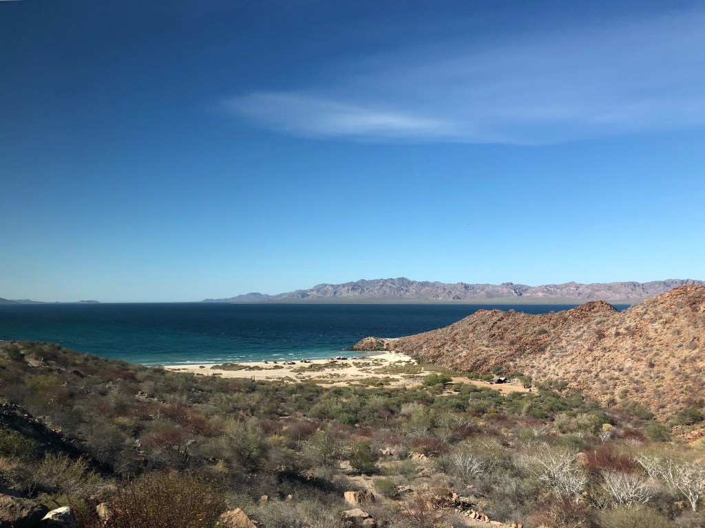 Le bus est à l’heure. Et il est vide. Nous sommes donc à notre aise pour les deux heures affichées de trajet (plutôt trois en réalité…) vers Mulegé. Néanmoins, peu de temps après le départ, les militaires arrêtent le véhicule et nous prient de sortir afin de procéder à une fouille des bagages. Je m’étonne une nouvelle fois du professionnalisme et de la cordialité des officiers en charge de vérifier le contenu de nos bardas. Ayant obtenu notre droit de passage, je peux me remettre à l’écriture. Mais pas pour longtemps…Au détour d’un virage, la route dévoile un paysage sensationnel ! Une immense, étroite et profonde baie, cerclée de montagnes brunes, et parsemée de superbes plages sauvages et désertes se laisse admirer sur notre droite. Nous longeons ainsi la Bahia Concepcion pendant près d’une heure, et je ne peux décrocher mon regard de cette hypnotisante scénographie.