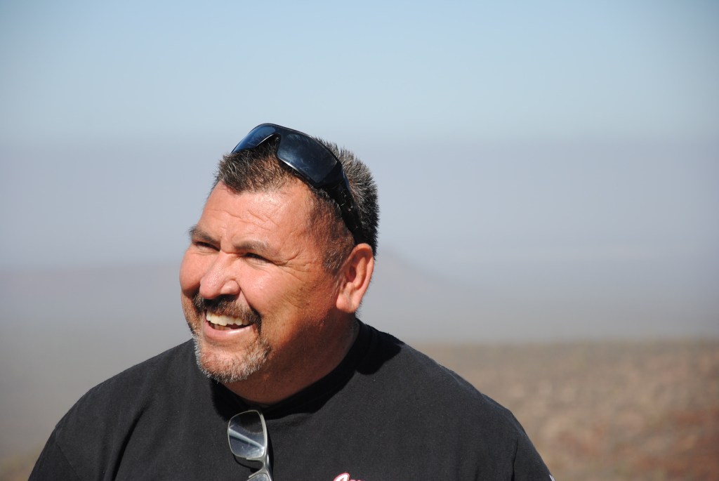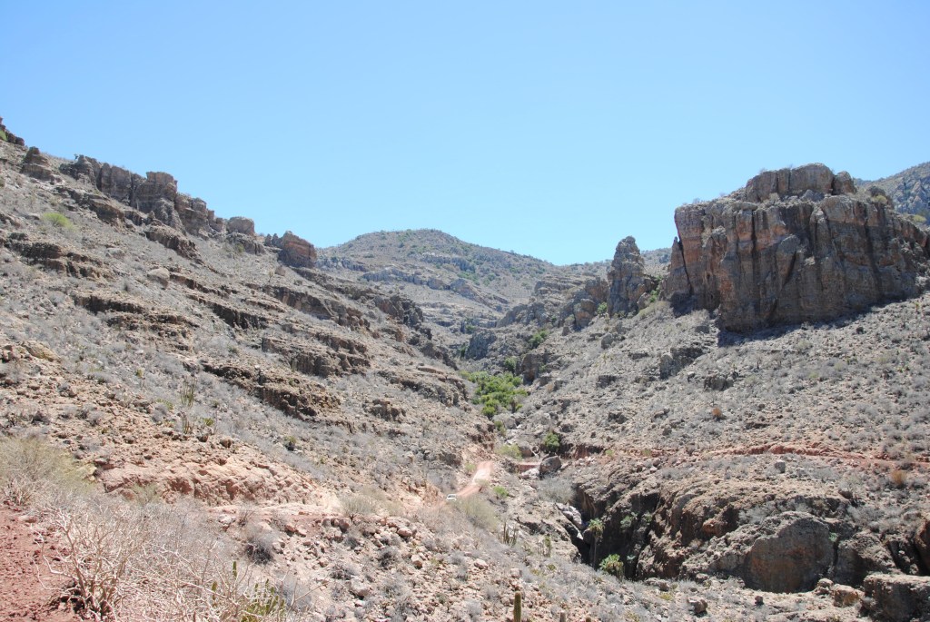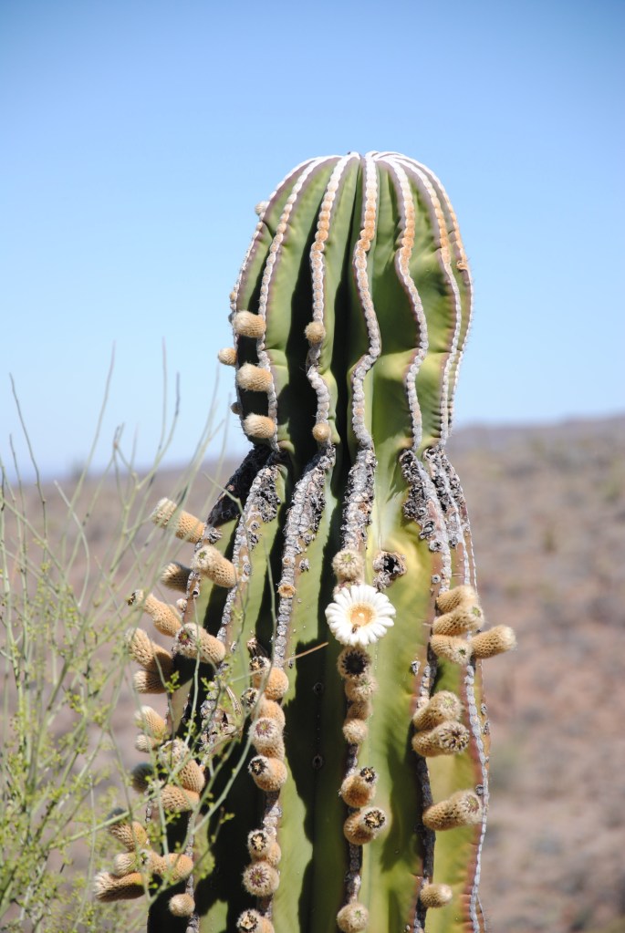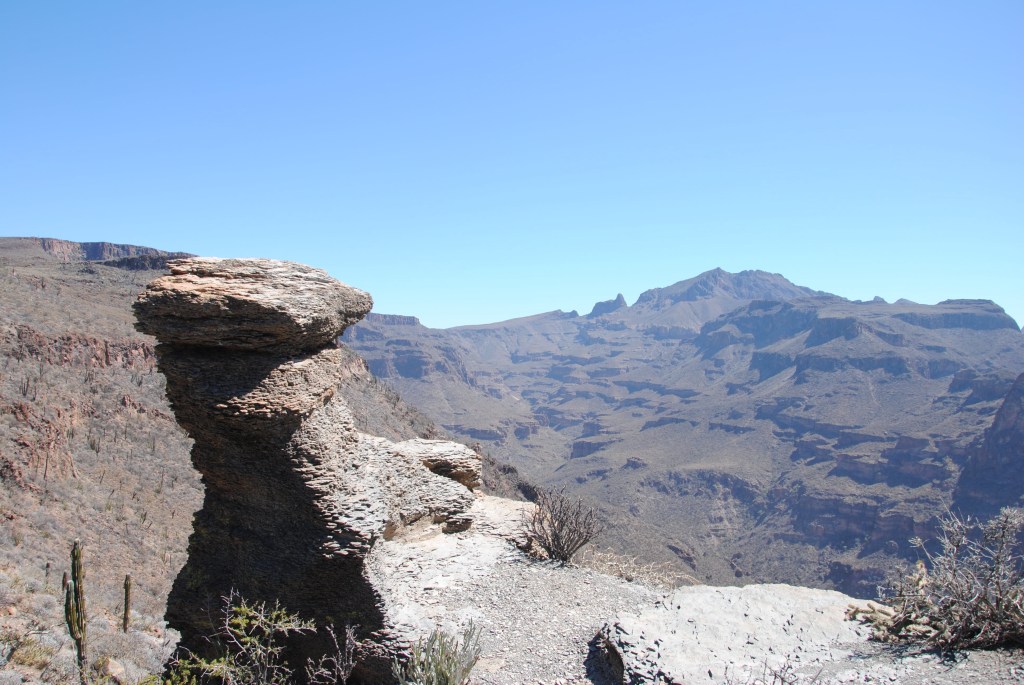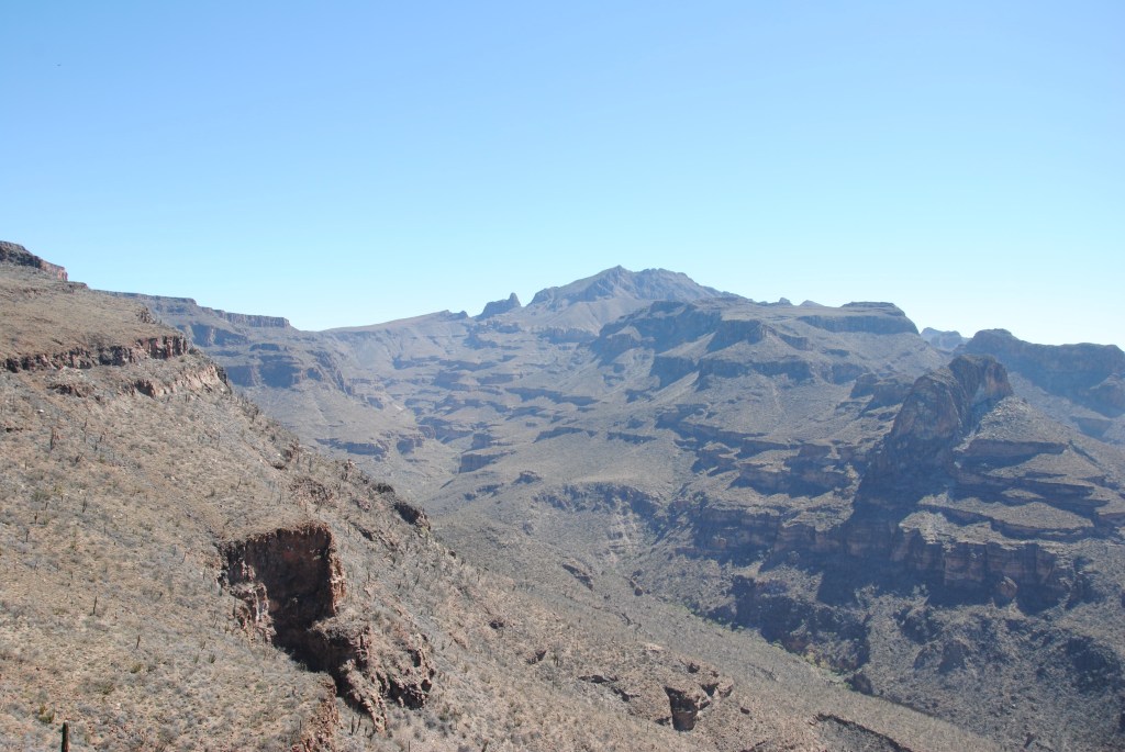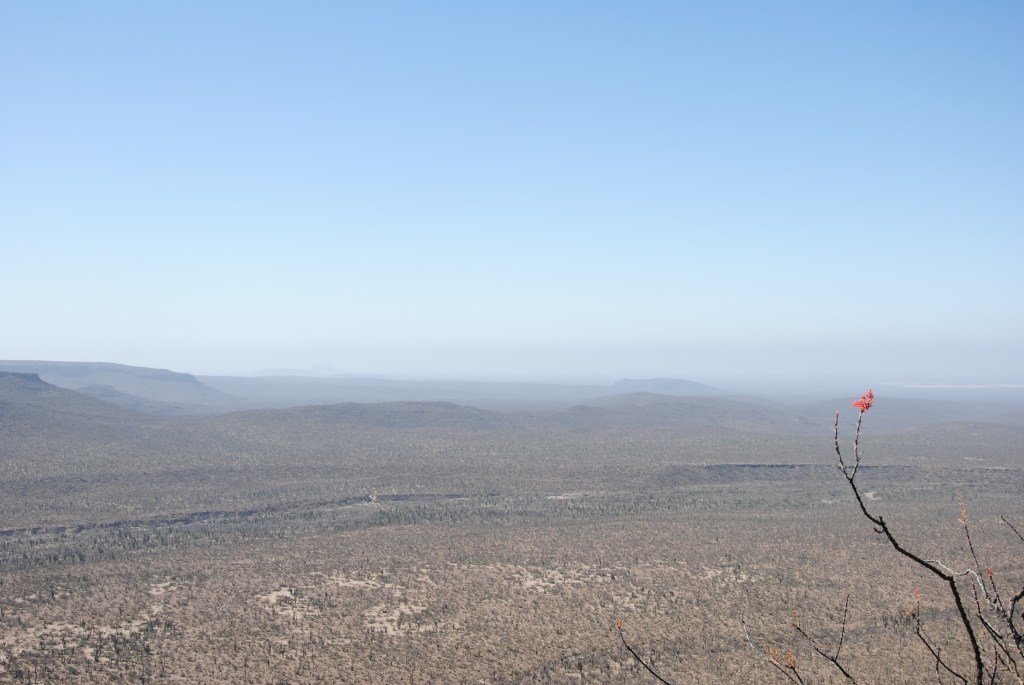 Lundi matin, Ranch Espinosa. Il fait à nouveau un temps superbe. Efrain et sa camionnette du siècle dernier sont prêts pour une virée dans la Sierra, et nous aussi. Le désert du Vizcaino s’étend à perte de vue ! Notre guide nous indique, au loin, une chaîne de montagnes brunes qui ferme l’horizon au nord, notre destination. La camionnette commence à grimper vers la Sierra, dont le point culminant atteint 1800m. Nous effectuons un premier arrêt, afin de contempler le Vizcaino. Il fait presque froid ! Depuis que nous avons quitté la côte Est, les vents du Pacifique ont considérablement rafraîchi l’atmosphère…Et, haut-perchés et à cette heure matinale, la chaleur du désert ne nous a pas encore atteint. De notre point de vue, nous voyons cette immense étendue beige et grise de sable, de pierres, de buissons grillés, et de cactus se fondre dans l’horizon dans un nuage de poussière.