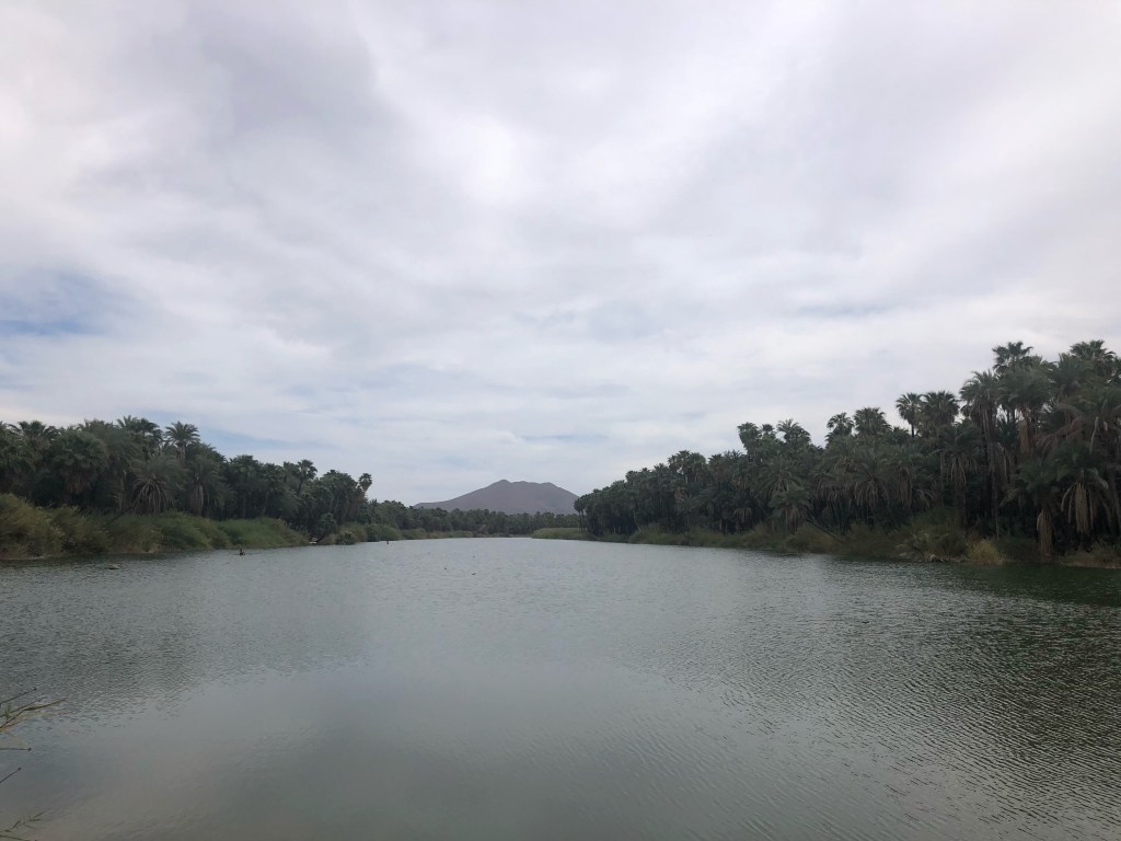 Nous convenons de nous renseigner auprès de sources plus fiables pour organiser l’expédition peintures le lendemain, et improvisons un plan B pour aujourd’hui. Nous marchons le long d’une palmeraie jusqu’à un petit lac, au bord duquel un camping loue des kayaks. L’endroit semble sorti tout droit d’un film de Jean Pierre Jeunet : sur un sol terreux jonché de bric-à-brac (banquette arrière de voiture, glacières en ruine, chaises en plastique en décomposition…), des hippies américains sur le retour entassent du matériel à l’arrière de leur « RV ». Au milieu, le gérant, quinquagénaire moustachu, en tenue de cycliste, balaye un irréprochable terrain de beach volley. Placide, il nous aide néanmoins à porter les kayaks jusqu’à l’eau, avant de reprendre sa primordiale et méticuleuse besogne.