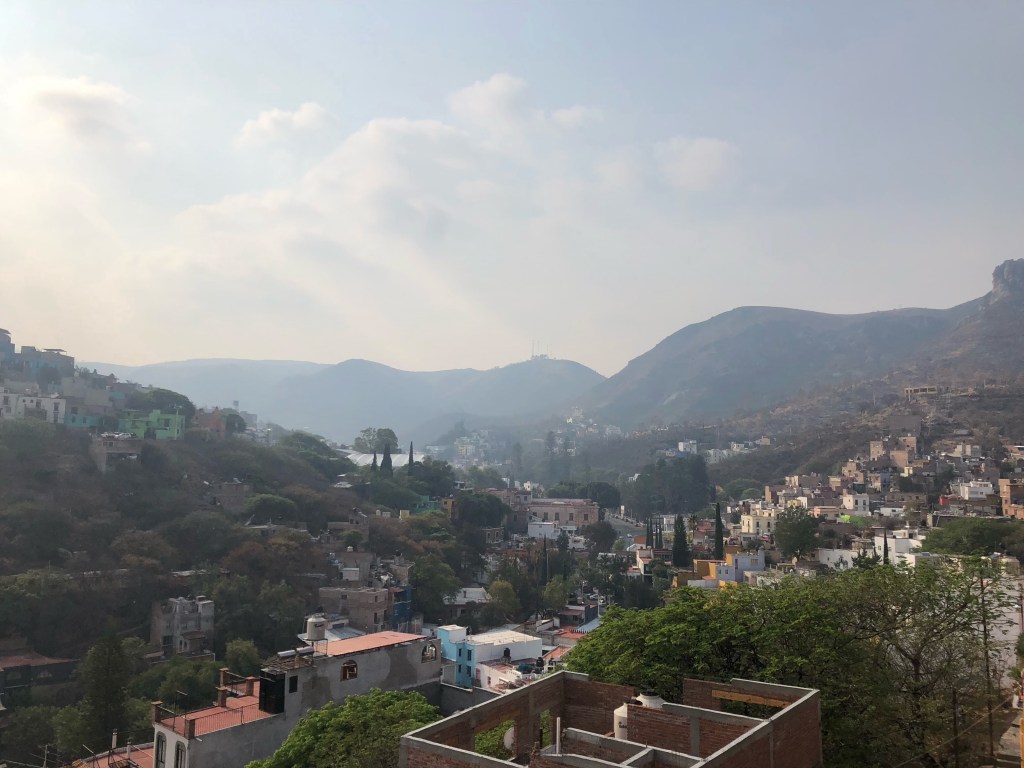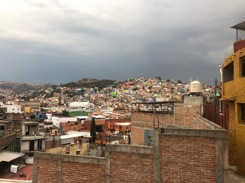Samedi matin, Guanajuato. Sur le toit terrasse de la Casa de Dante, la vue sur la ville est prodigieuse. Des maisons cubiques et multicolores tapissent les pentes des nombreux vallons de la cité coloniale. En admirant le paysage, je souris au souvenir de notre arrivée ici.