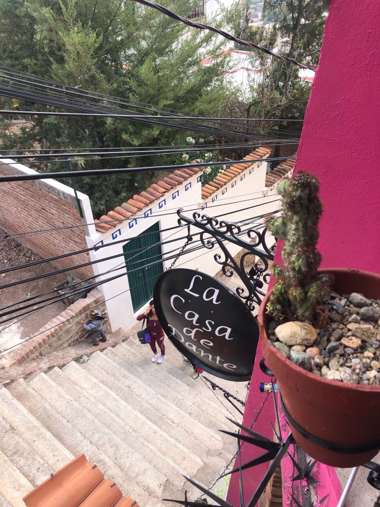 Le bus était en retard. Vers une heure du matin, un taxi nous a déposé en haut d’un immense et abrupte escalier aux marches inégales. Là, bien aidés par un jeu de flèches et de panneaux, nous avons trouvé sans mal la Casa De Dante et sa jolie façade rose joliment fleurie. Mais personne pour nous ouvrir, calme et obscurité semblant régner à l’intérieur des murs. Je me suis alors affairé à appeler l’hostel et questionner le voisinage, mais en vain. Alors que passer la nuit dehors devenait une option (je pouvais toujours monter la tente dans les escaliers), la Casa de Dante s’alluma comme par magie, et une charmante petite dame nous ouvrit chaleureusement, suivie par une poignée d’invités aussi alertes qu’en plein jour. Et une fois nos quartiers atteints, l’agitation disparut aussi vite qu’elle était apparue, par quelque mystérieux sort. Perturbé par cette entrée fantastique, sans doute aussi par la décoration énigmatique du lieu, j’ai mis un temps certain à m’endormir…Dans l’enfer de la maison de Dante, le moindre bruit revêt un caractère surnaturel et inquiétant…