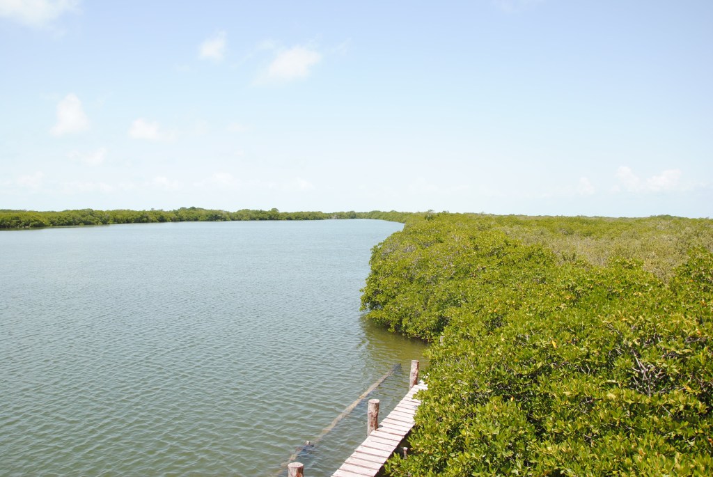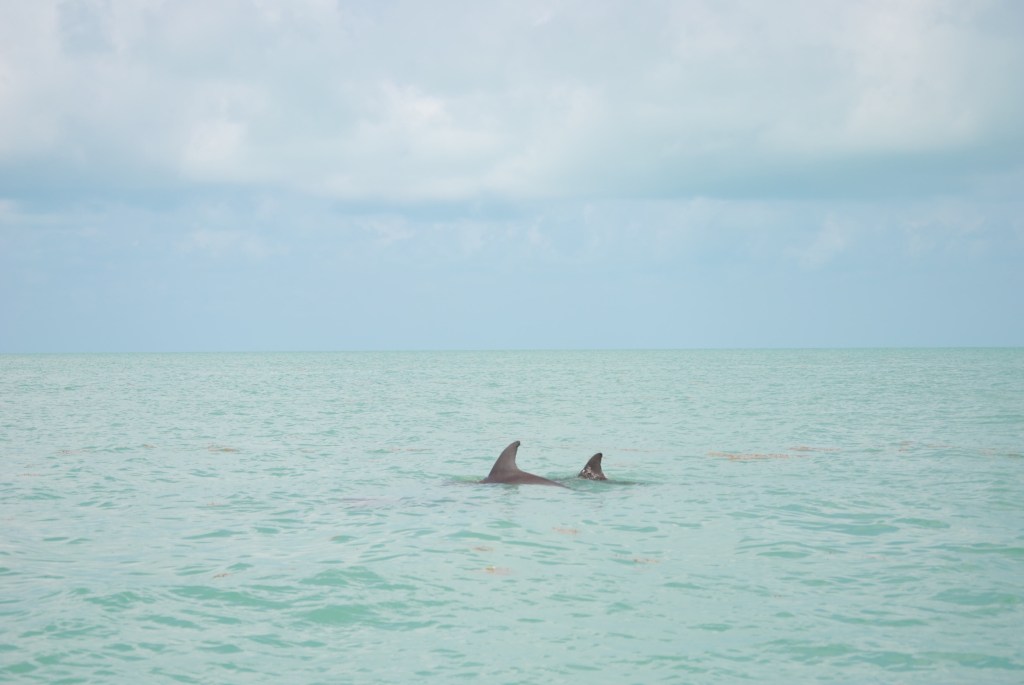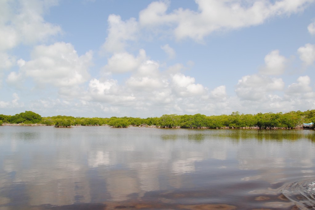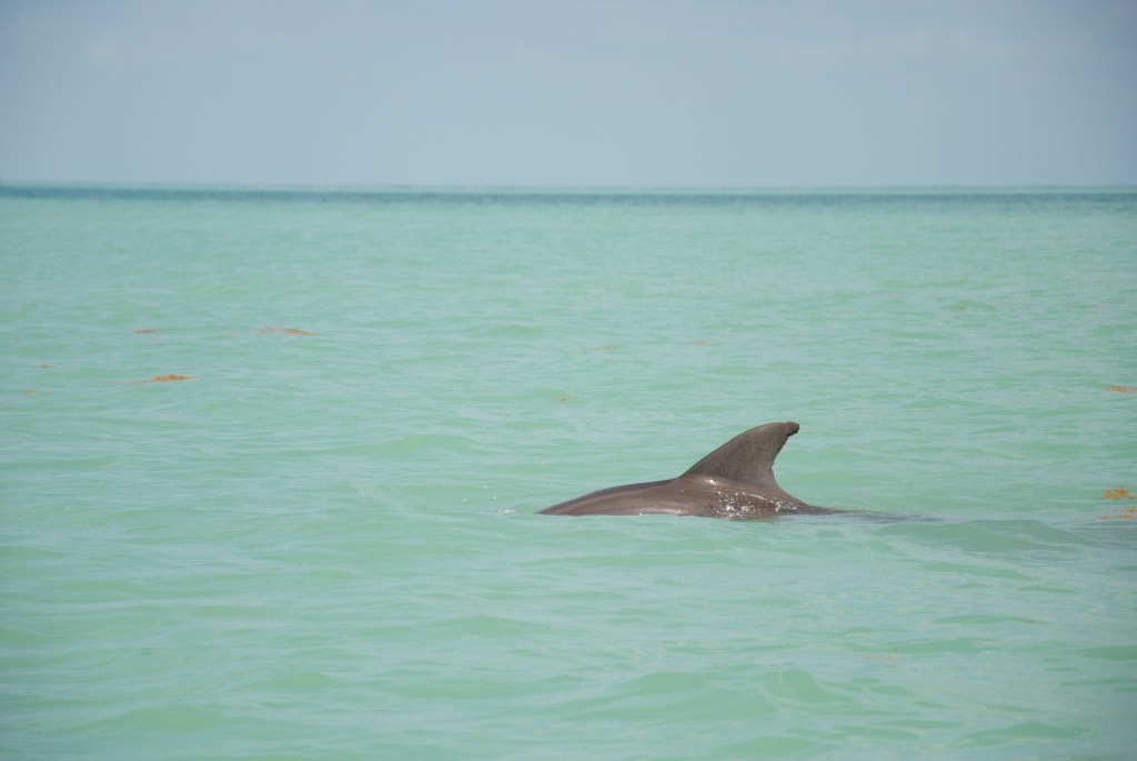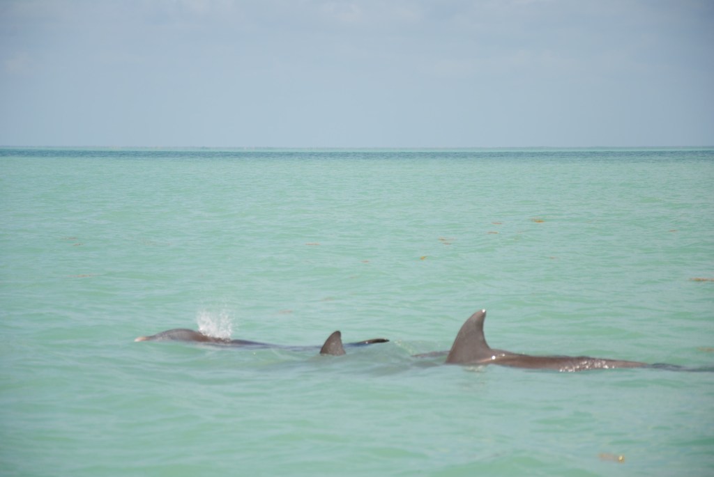 Alors que nous terminons nos jus d’ananas frais, un drôle de petit bonhomme, casquette bleue et pommettes saillantes, nous propose un tour en lancha, entre mer et lagune. Un couple de jeunes mexicains est déjà partant et recherche des volontaires afin d’adoucir le coût. Nous n’hésitons pas, et rejoignons les deux tourtereaux sur le chemin qui mène à l’embarcadère, au milieu de la mangrove. Le capitaine Antonio nous briefe sur le programme des prochaines heures : observation des dauphins, chasse (visuelle) à la tortue, snorkeling le long de la petite barrière de corail, et baignade dans une “piscine naturelle”. Alléchant…Nous slalomons dans la mangrove, avant de déboucher dans une grande lagune, séparée de la mer pas une frontière invisible. Comme s’ils avaient été prévenus de notre arrivée, cinq dauphins nous attendent, puis dansent joyeusement autour de l’embarcation. Nous sommes les seuls bipèdes à des kilomètres à la ronde, et profitons ainsi du spectacle en toute sérénité, pendant une trentaine de minutes.