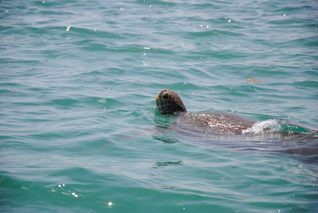 Nous laissons nos amis cétacés, et nous rapprochons de la barrière de corail pour y guetter les tortues. Celles-ci se font d’avantage désirer, mais nous finissons par en croiser un imposant spécimen, qui glisse longtemps entre deux eaux avant de hisser sa petite tête hors des flots. Le temps d’un coup d’œil, et d’un cliché, et la bête sonde à nouveau. J’aime ces dames des océans, dont l’élégante langueur a des vertus presque thérapeutiques…
