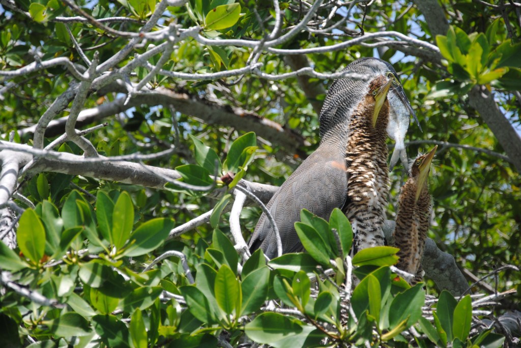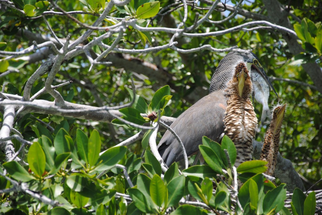 Il est temps de rentrer au bercail. Antonio nous offre tout de même un détour pour observer un prodigieux nid de hérons tigres. La scène est époustouflante ! Maman héron, un énorme poisson dans son bec, nourrit deux gros poussins à l’improbable toison bigarrée. Émouvant !
