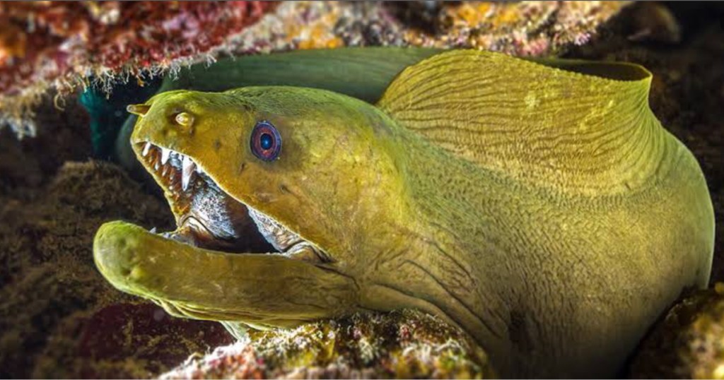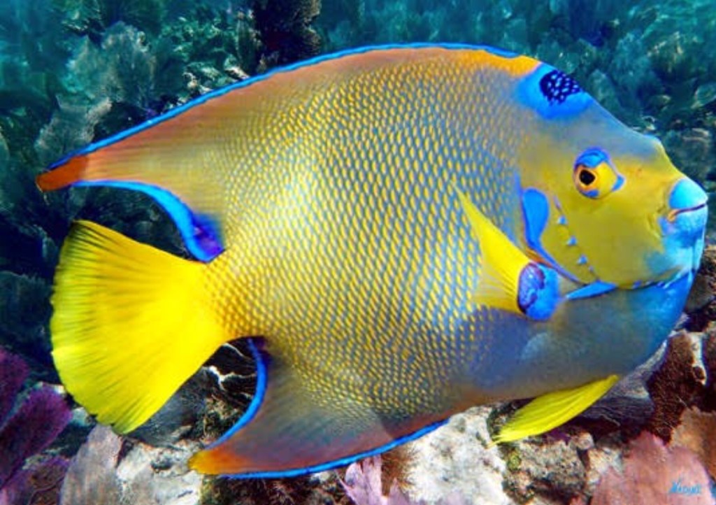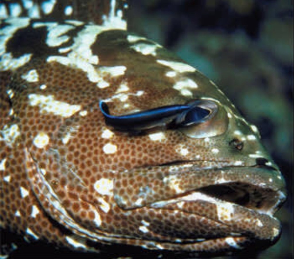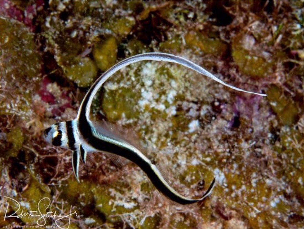 Traversant la montagne d’algues, le bateau nous mène en cinq petites minutes à la barrière de corail, pour notre première descente. Nous atteignons sans encombre le fond sablonneux à une vingtaine de mètres de profondeur, et commençons notre exploration. La barrière forme ici une longue barre triangulaire, comme un Toblerone sans fin, coupée ça et là de petits canyons la traversant dans sa largeur. Nous la remontons en empruntant ces ruelles étroites et magiques, en prenant grand soin de ne pas toucher les fragiles parois. Le corail prend de multiples formes, des grandes feuilles mauves alvéolées aux longs tubes jaunes rappelant le sommet du crâne des “snorky” de mon enfance. Au milieu de cette forêt fantastique se bousculent foule de poissons tropicaux, tangs, durgeons, ou wrasse. Je reste bouche-bée devant un sublime poisson ange reine multicolore qui se cache dans la fente d’une paroi de l’un des innombrables canyons. Plus loin, Léo attire notre attention sur une cavité creusée dans le corail : une gigantesque murène d’un vert vif, ondule de tout son long. Plus petite mais tout aussi élégante, une murène tachetée nous salue avant de disparaître dans un minuscule trou. Outre la beauté du décor, quelques rencontres inopinées égayent notre voyage, comme ce petit poisson spotted drum à la nageoire étonnante, où ce poisson vache à la face triangulaire et trapue. Et, dans un moment de grâce infinie, une superbe tortue, curieuse, nage au milieu de nous avant de passer son chemin. Magique !