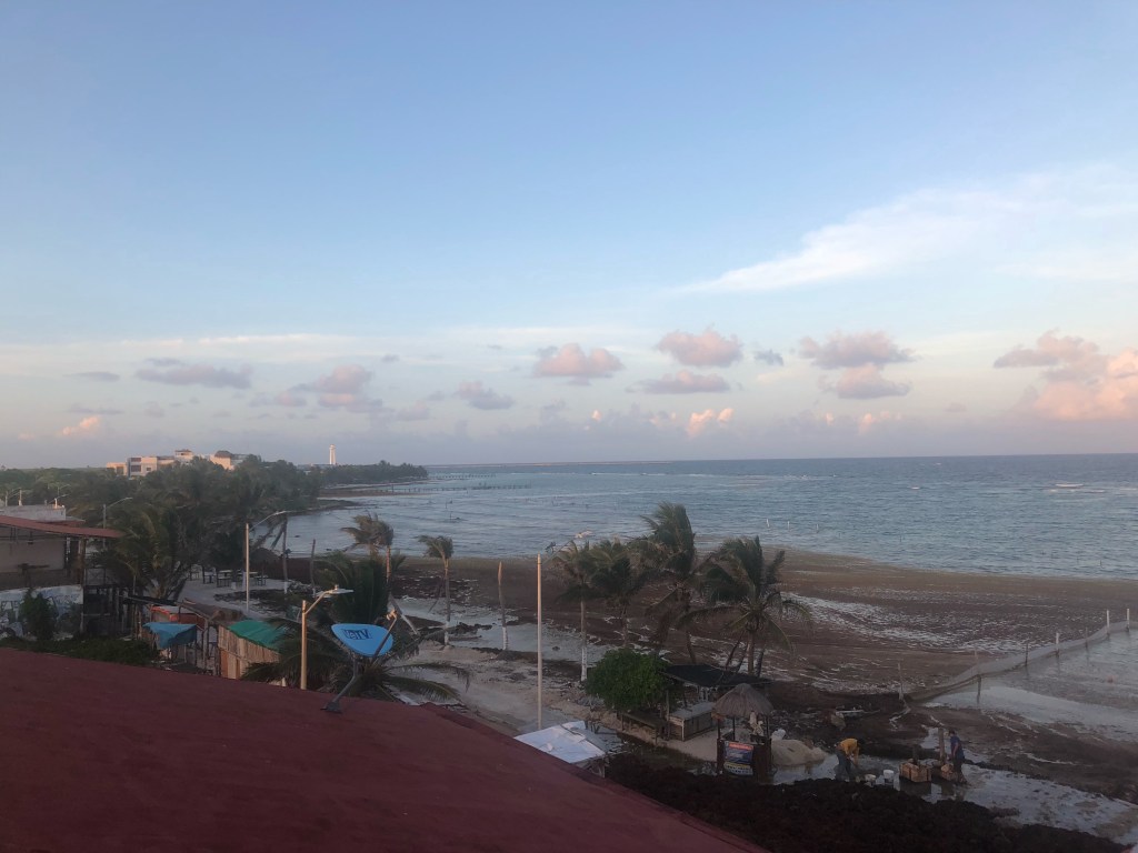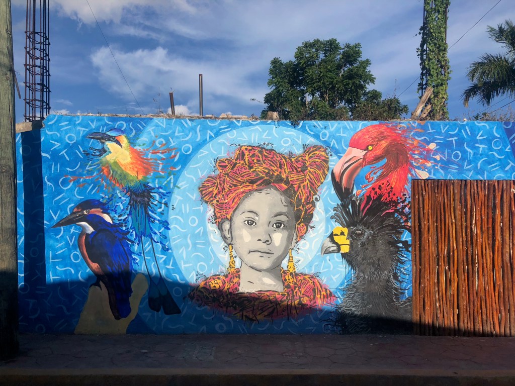 Mardi matin, Mahahual. La nuit a été mauvaise, mais, m’étant rendormi profondément au petit matin, je me réveille à 9h de mon humeur habituelle, avec l’envie de découvrir les environs. Je passe un long moment au téléphone avec ma sœur, et la matinée est déjà très avancée lorsque nous partons déjeuner. Le petit déjeuner dans un restaurant local et authentique sera suivi d’un second à la terrasse d’une petite panaderia qui vend…des Kouign-amanns. Le goût n’est pas au rendez-vous mais le café sortant d’une machine de barista italienne est délicieux. Repus par cette double collation, nous faisons le tour des écoles de plongée, bien décidés à explorer la barrière de corail le lendemain. Rendez-vous pris avec Alux Divers, nous marchons vers l’extrémité nord du village et les Eco-cabañas Bluekay. Hasard des courants, l’odeur des algues est absente de ce joli quartier, et notre nouvelle chambre est incroyablement confortable.
