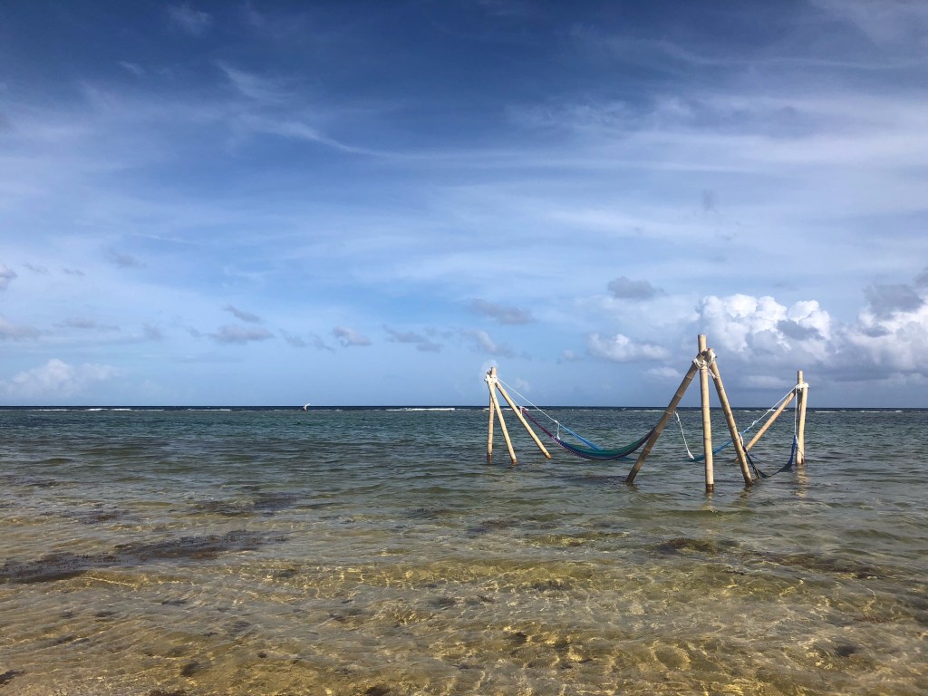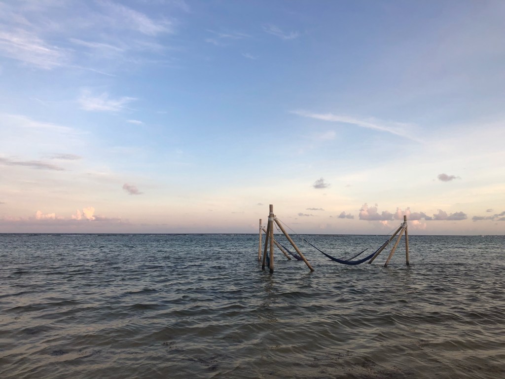 Heureux, nous posons nos serviettes sur la plage privée, quasi déserte, de l’établissement, et nageons jusqu’à un arbre échoué sur une minuscule barrière de corail à 100 mètres du rivage. Assis confortablement sur notre nouveau banc, nous regardons le vent déformer les nuages, les pieds dans une eau chaude et transparente.