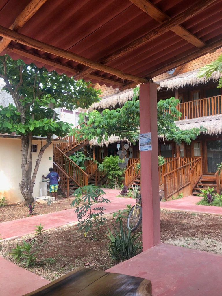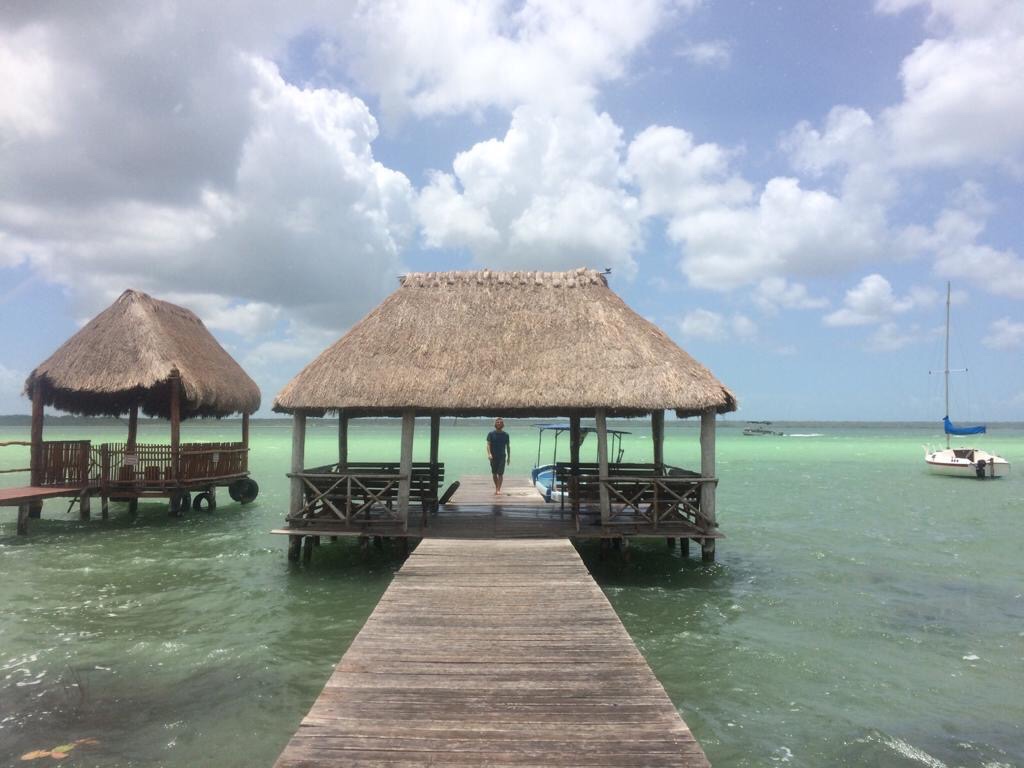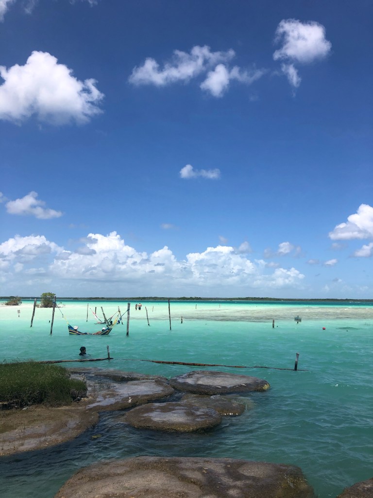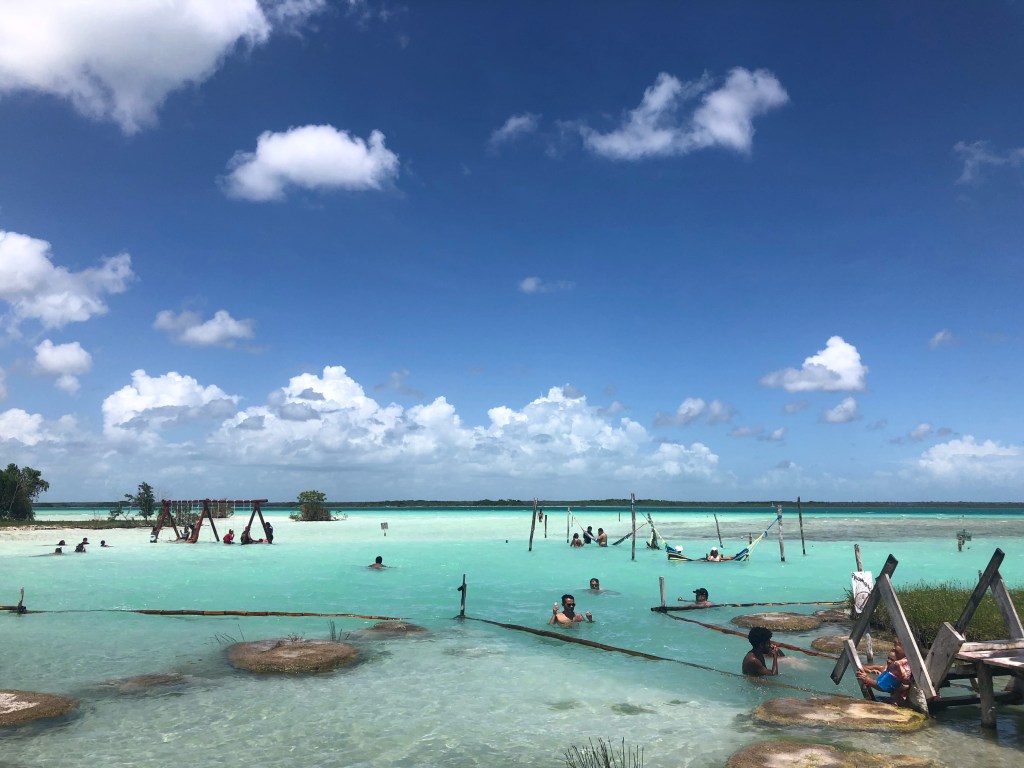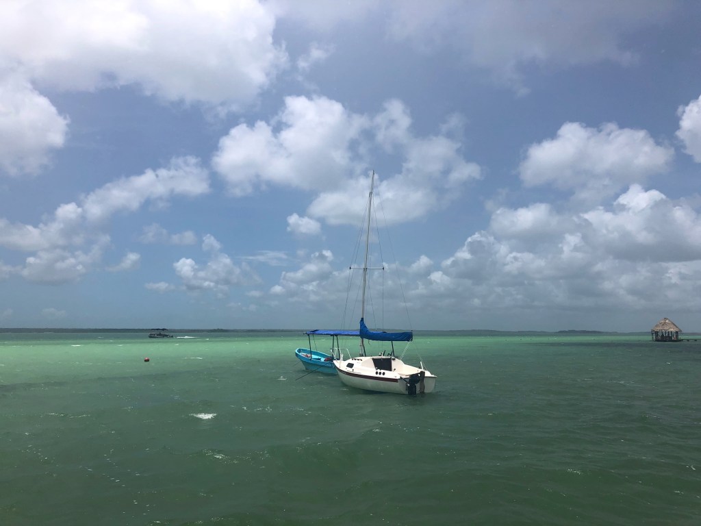 Samedi matin, Bacalar. Un nouveau petit déjeuner à rallonge marque le début d’une belle journée au bord de la lagune. Vers 9h30, Colin fait une entrée remarquée à notre table, les yeux encore gonflés de sommeil, et le short à l’envers. Il nous fait d’ailleurs remarquer qu’il est fagoté comme le bon roi Dagobert, mais gardera sa mise intacte jusqu’au soir. À 10h, c’est Mika qui rejoint la troupe, « hangover glasses » sur le nez et démarche mal assurée. Pari gagné, la jeune femme a succombé à la nuit bacalaraise…En fin de matinée, nous rejoignons notre « sea house » de ville, soit le ponton découvert à notre arrivée. Nous y passons une après-midi agréable, entre baignade et écriture, caressés par le vent tiède qui souffle sur la lagune.