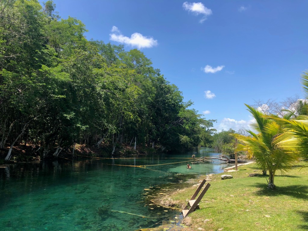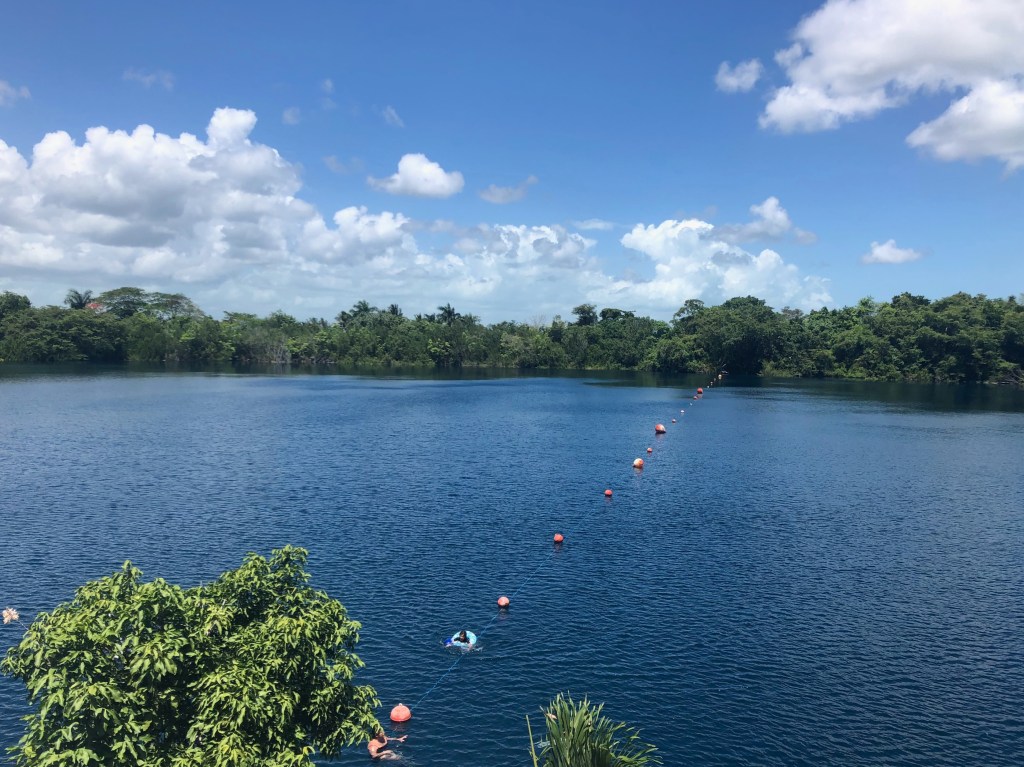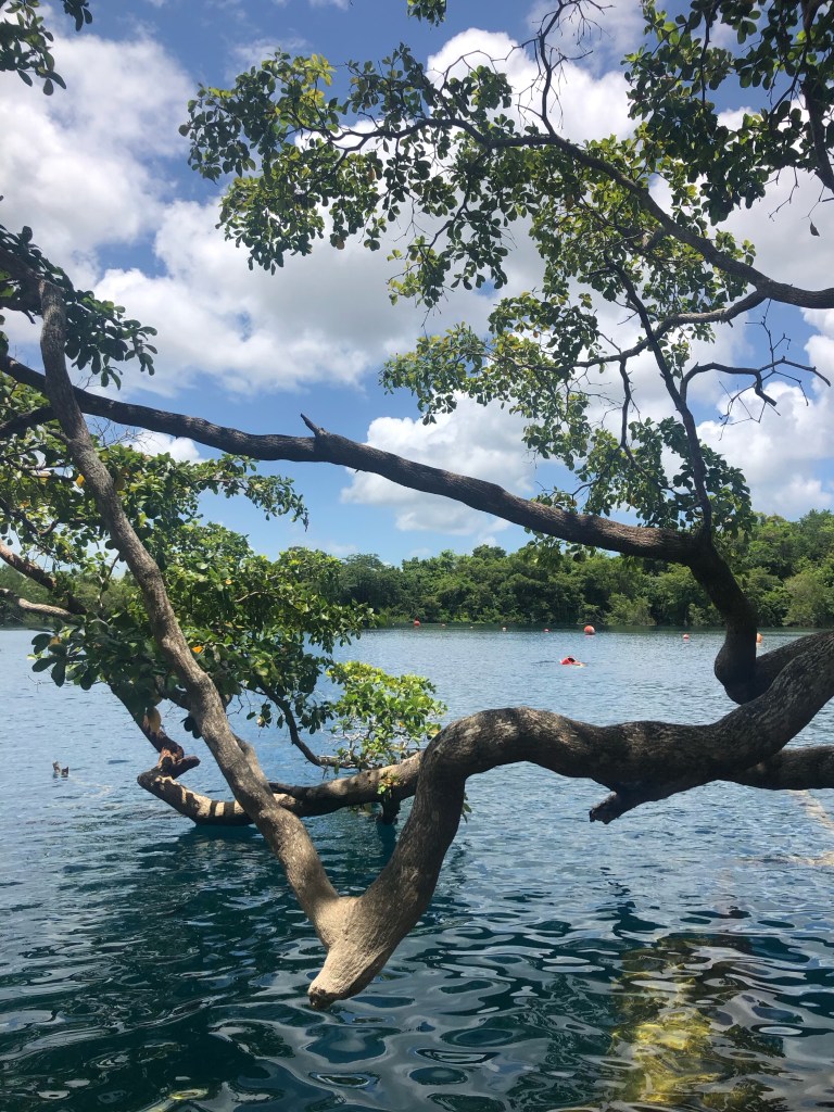 Avec sa forme circulaire, ses 90 mètres de fond, et les grands arbres qui l’entourent, le Cenote Azul est comme un grand puit creusé au bord de la lagune, en pleine forêt. L’eau cristalline revêt toutefois une teinte profonde, signe manifeste de la grande profondeur. Nous plongeons dans le bassin à l’onde si pure, et le traversons jusqu’à atteindre la robuste branche d’un arbre qui s’affaisse juste au dessus de la surface. Là, de petits poissons nous entourent par dizaines et se régalent de nos peaux mortes, nous économisant le coût d’une fish pedicure. Pendant la durée du soin, nous avons tout loisir d’admirer les moucheroles et kiskadee qui nous régalent par leurs numéros d’acrobates entre ciel et “mer”. Nous séchons sur le bord du bassin, profitant du calme et de la sérénité des lieux. Puis repartons sur nos vélos sans vitesses vers la Playa Cocalito. En chemin, un point de vue surplombe le cenote, dévoilant son épatante localisation juste au bord de la lagune.