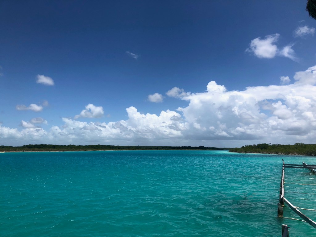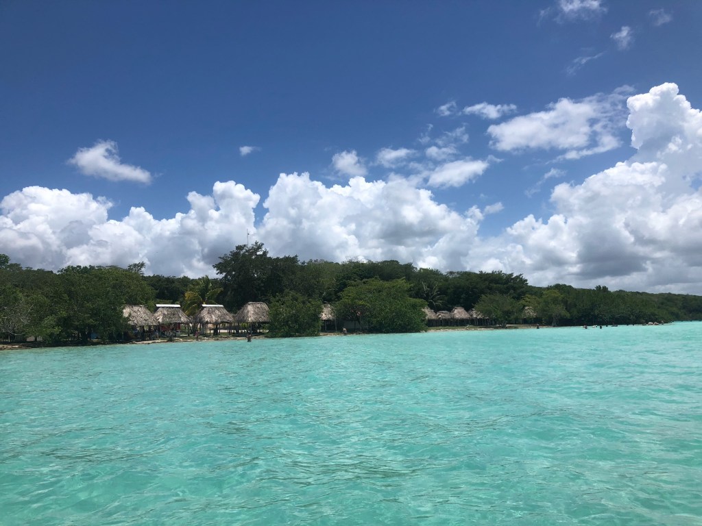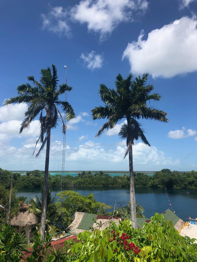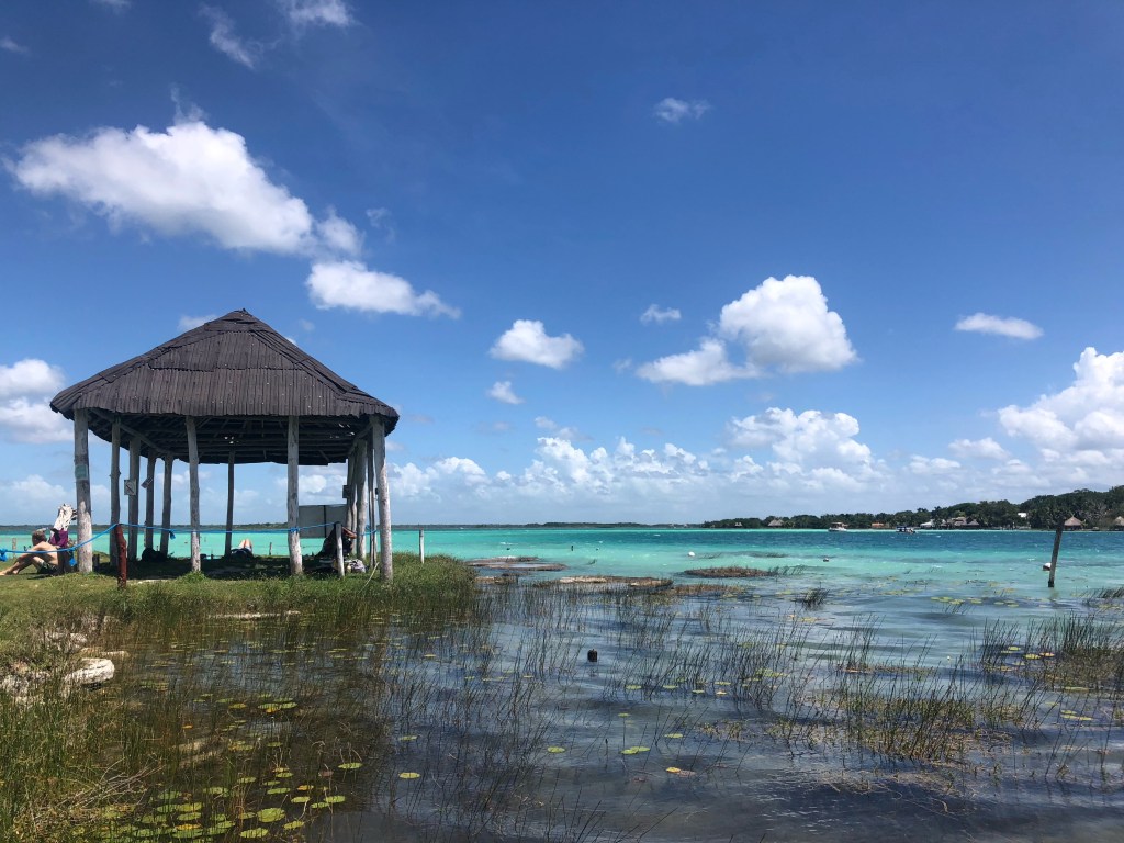 Jeudi matin, Bacalar. Le jardin de l’hôtel dispose d’une cuisine en plein air, et Arlette a préparé de délicieuses tartines d’avocats pour le petit déjeuner. Nous passons un long moment à discuter, sirotant un délicieux café dans notre nouveau havre de paix. À la mi-journée, nous nous activons enfin, louons des vélos, et partons à la découverte de la lagune. Sur la petite route qui longe la rive, la vue sur le lac est le plus souvent bouchée par des hôtels et propriétés privées et les écrins de nature luxuriante qui les entourent. Mais, ça et là, entre deux arbres, ou à travers une grille, nous apercevons un paysage hallucinant. Les eaux du lac, que le soleil fait scintiller, sont turquoises, azures, marines, ou vertes. Au cœur de ces teintes irréelles, de petits îlots entourées de sable blanc achèvent de donner une dimension extraordinaire à ce lieu unique. Nous pédalons jusqu’à la Playa Cocalito afin d’admirer pleinement le décor, mais décidons de pousser d’abord jusqu’au Cenote Azul situé un peu plus au sud, avant de revenir s’étendre sur les rives de la lagune aux sept couleurs.