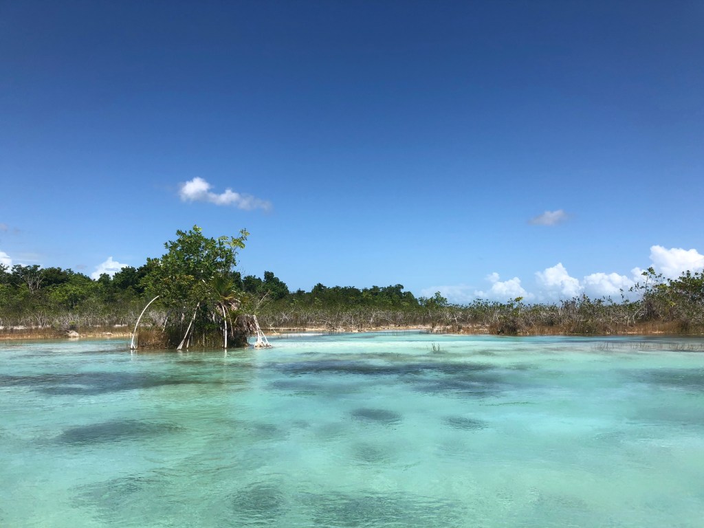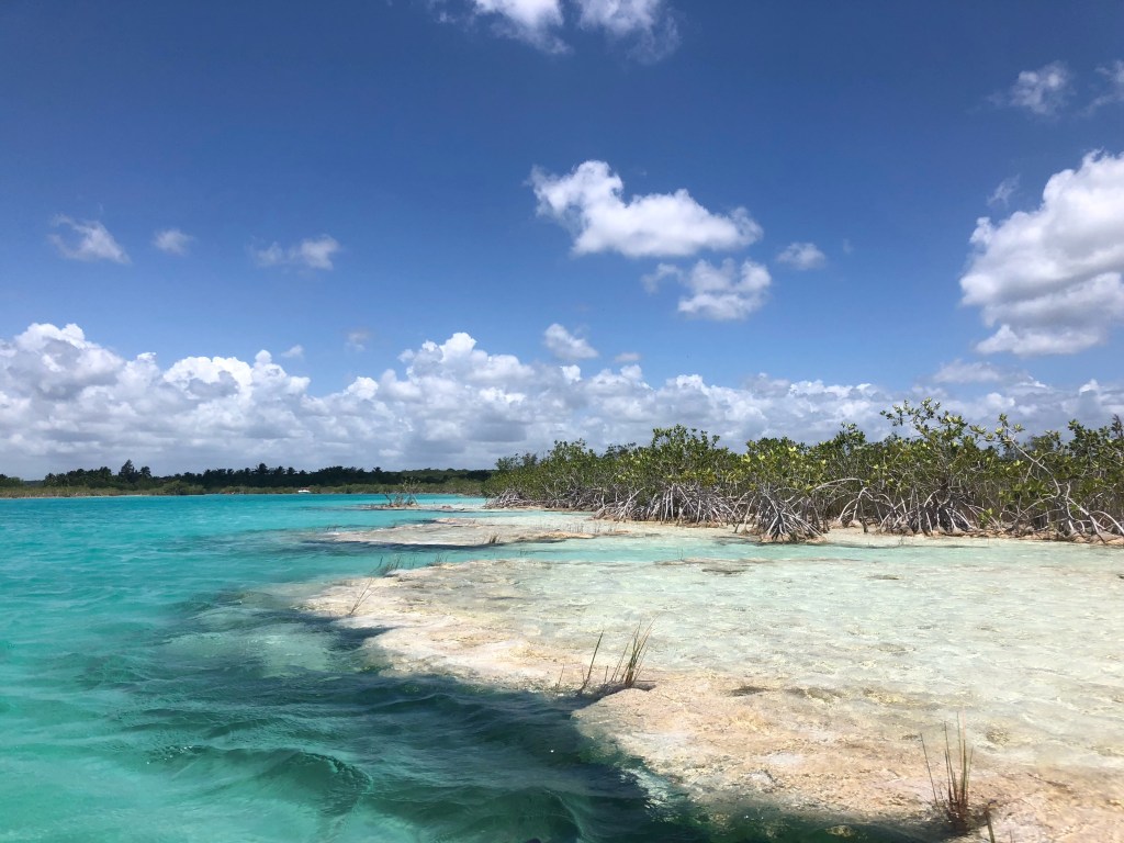 Le cours d’eau dessine quelques virages dans la mangrove, avant de se jeter dans la gigantesque lagune. Ici, à l’extrémité sud du lac, nous réalisons à quel point il est protégé de l’urbanisation. Passé le village de Bacalar, seules trois maisons perdues au milieu de la forêt, quand la rive opposée est vierge de toute construction. À cet endroit, le sable blanc donne des allures de Maldives à la lagune.