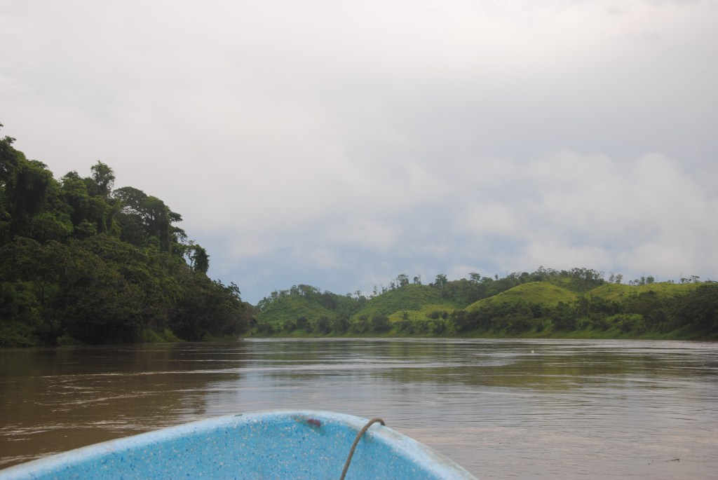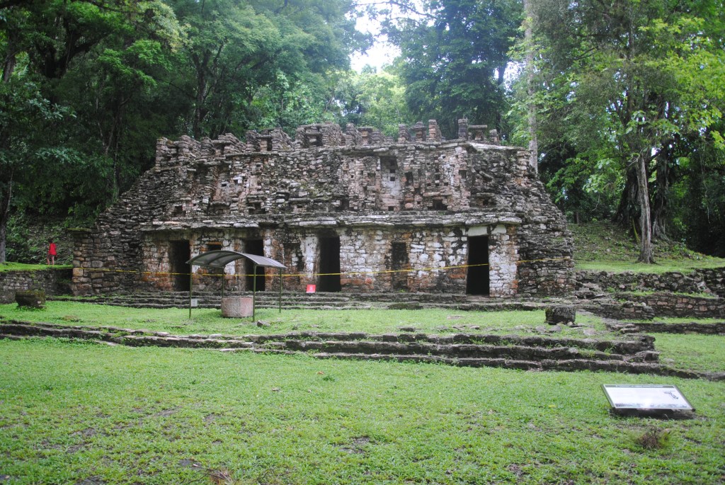 Samedi matin, Frontera Corozal. Il est 7h et Arlette et moi sommes les 8ème et 9ème personnes à signer le registre d’entrée du site de Yaxchilan. Seul un groupe de francophones nous a devancé. Un homme moustachu et taiseux nous loue les services de sa lancha, et nous accompagne à “l’embarcadère”, empilement de barques vétustes s’entrechoquant dans le courant de la rivière. Le spectacle est amusant: des bateliers, en sous-vêtements, s’affairent à vider les hectolitres d’eau tombés dans leurs embarcations durant la nuit. Notre chauffeur s’exécute lui aussi, en slip d’un gris sale après avoir pris soin d’ôter ses vêpres. La manœuvre prend un temps certain, et nous voyons partir la lancha des francophones. Notre bateau vidé, il faut alors s’extirper du labyrinthe des autres navires amarrés entre eux par un système au génie tout mexicain. Une fois sur les flots, c’est le moteur, toussotant, qui menace de nous lâcher. Mais la barque tient finalement, et son taciturne capitaine nous dépose aux portes de la cité maya, bien cachée dans les arbres.