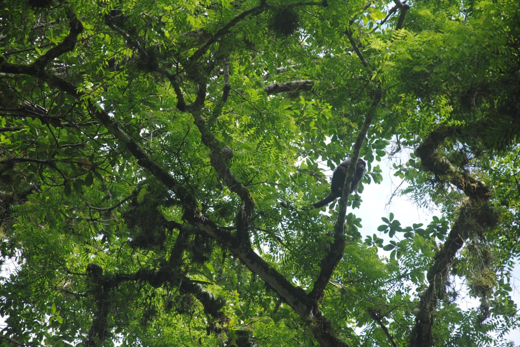 En haut des marches qui mènent au plus haut temple de la ville, cent mètres au-dessus de la plaza, une nouvelle bande de toucans se disputent les fruits haut perchés dans de grands arbres presque noirs. Un trogon imperturbable observe la scène de ses yeux si ronds. Un petit coup d’œil à la montre nous indique que nous avons très largement dépassé le temps imparti, et que notre moustachu au slip kangourou nous attend depuis un bon moment déjà.
