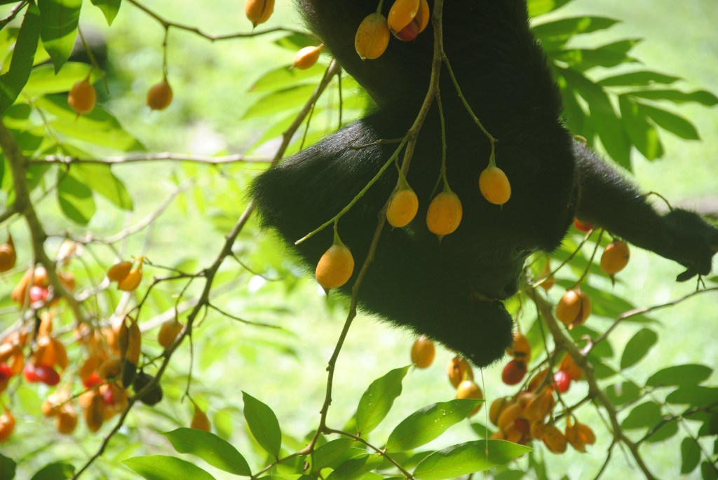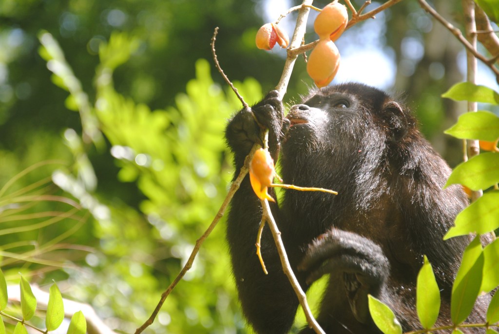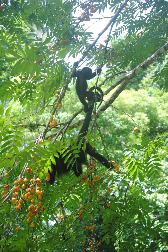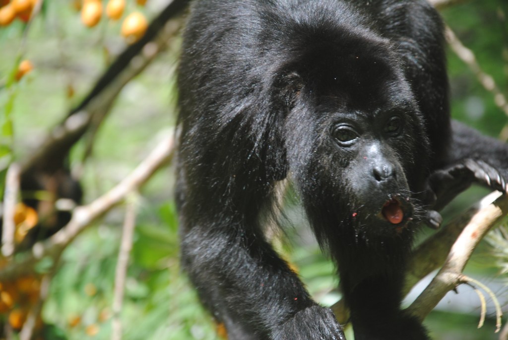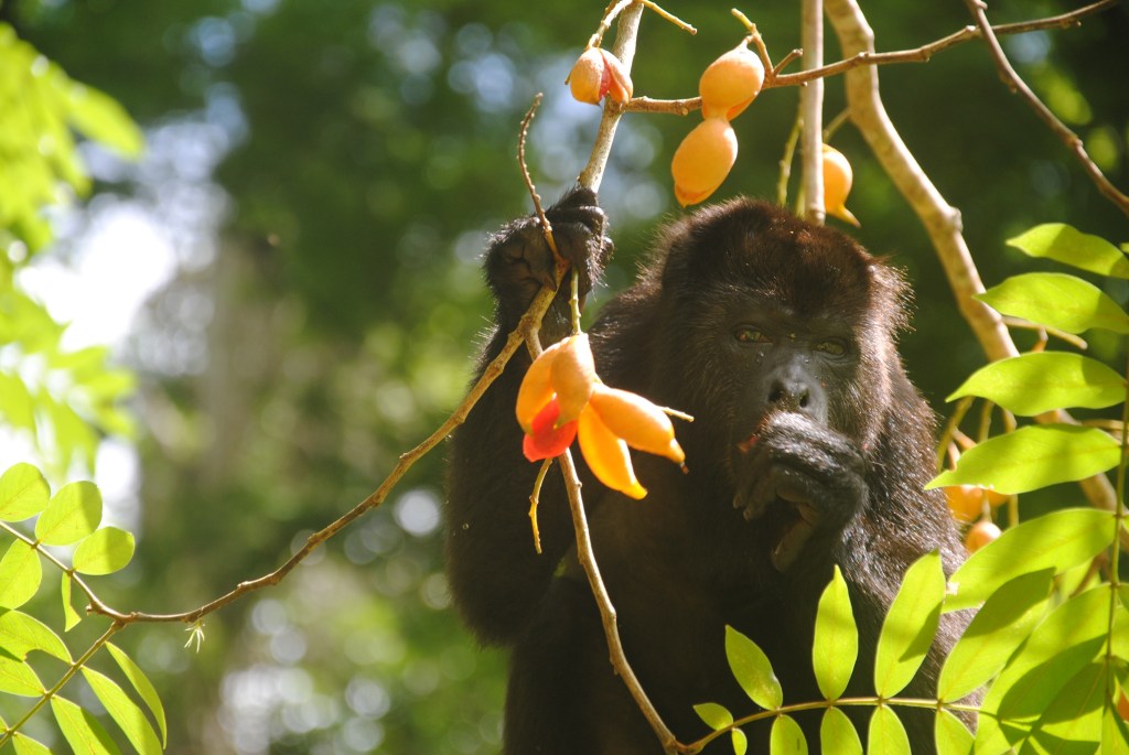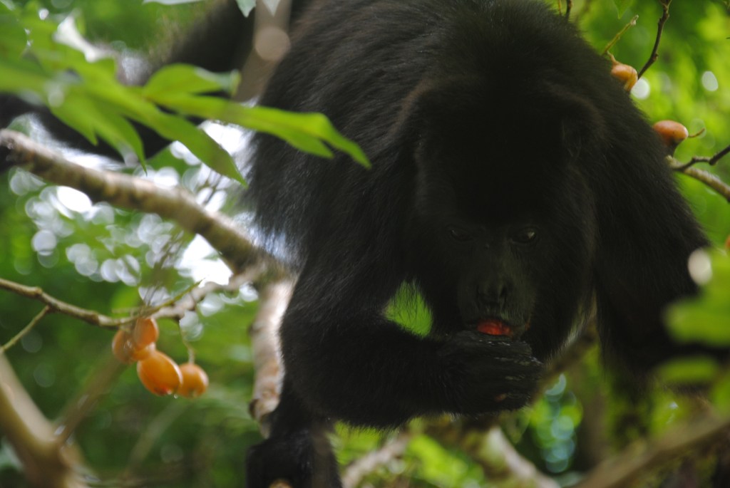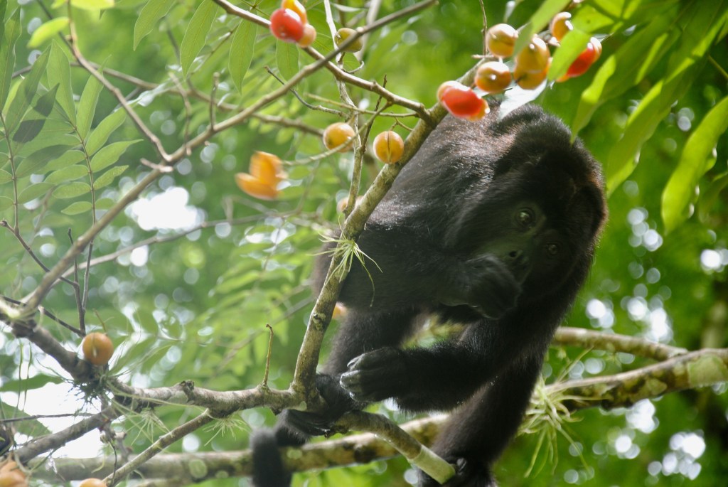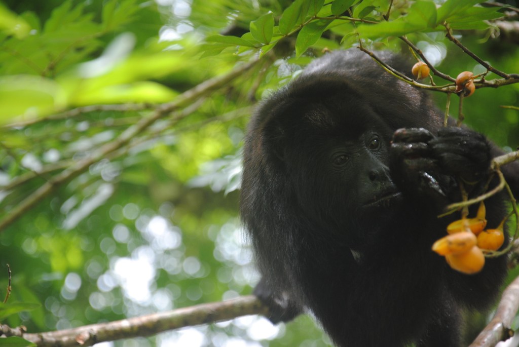 Nous redescendons les marches, mais, au moment où nous prenons la direction de la sortie, un bruit familier nous parvient des cimes. Une famille, nombreuse, de singes hurleurs a choisi un arbre aux fruits oranges et rouges pour le déjeuner. Nous les regardons descendre vers les branches les plus basses, et les plus fournies. La scène qui suit restera gravée à vie dans ma mémoire : gardant un œil sur nous, mais nullement timides, les singes entament leur festin, à quelques mètres à peine. Certains s’aventurent même à moins d’un mètre ! Abasourdis, nous les regardons engloutir avec minutie des dizaines de fruits, sous le commandement d’une robuste et énergique femelle. Un bébé fait ses premiers pas, poussé par sa mère qui fait mine de ne pas s’en soucier, tout en surveillant du coin de l’œil ses moindres mouvements. Les membres de la famille se succèdent à nos côtés, dans une procession magique, prodigieusement émouvante. Le temps s’arrête, et nous oublions tout, y compris ce pauvre bougre de capitaine qui se languit de nous sur son rafiot de fortune. Repus, les singes s’éloignent, et nous revenons lentement de notre voyage en terre simiesque. Nous retrouvons notre pilote, peu ému de notre retard considérable, et naviguons vers Frontera Corozal, dans un silence partagé qui nous aide à prendre conscience du caractère exceptionnel de ce que nous venons de vivre.