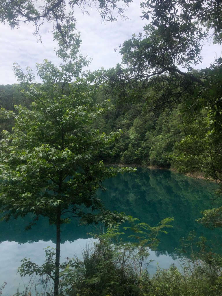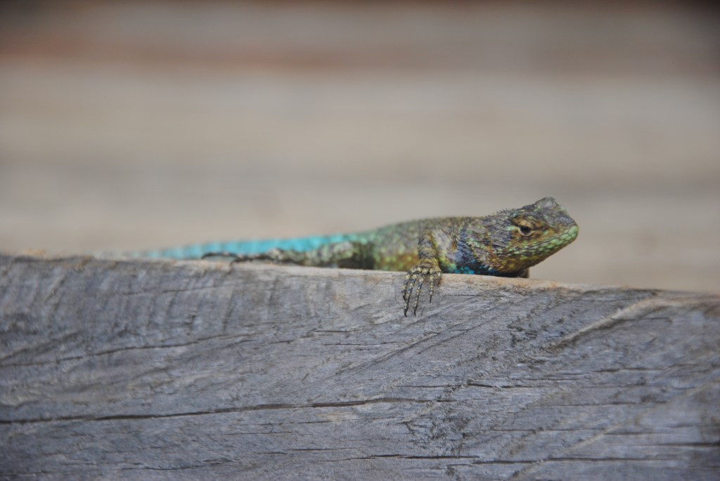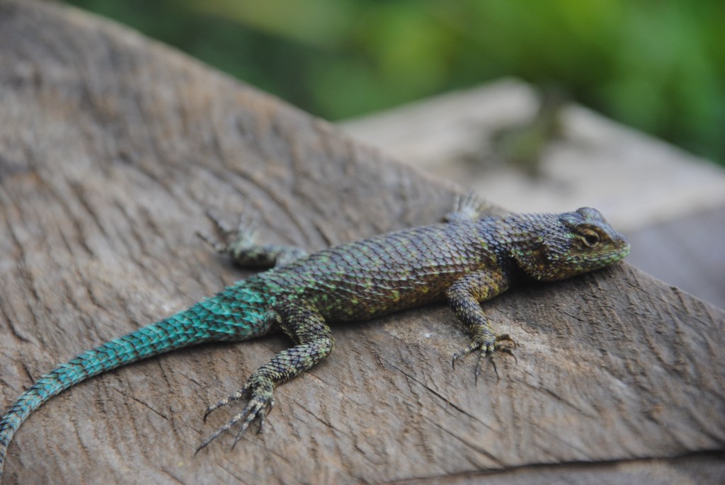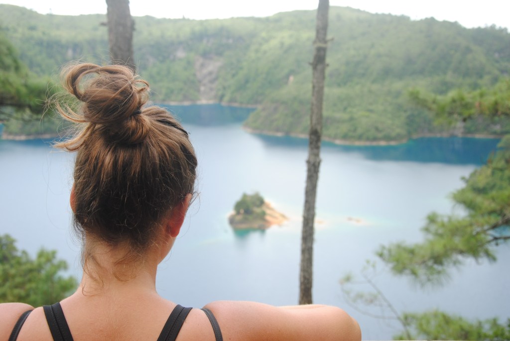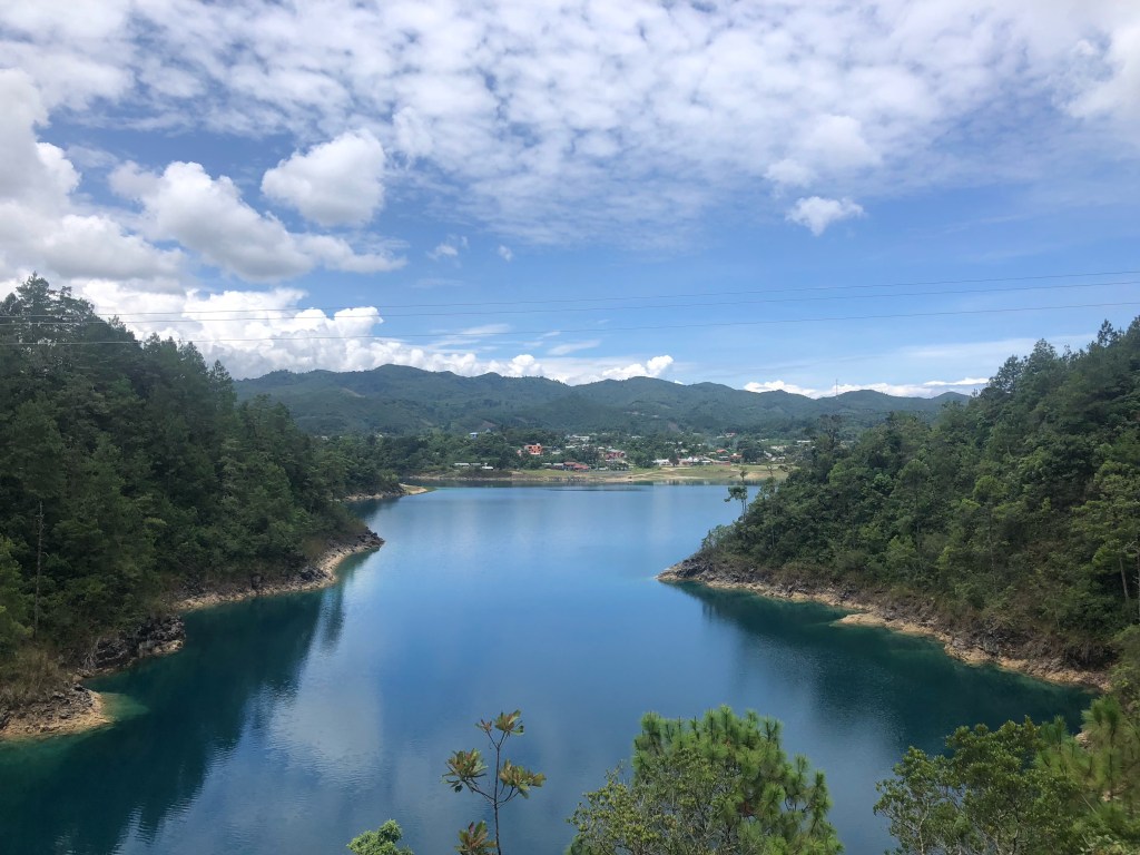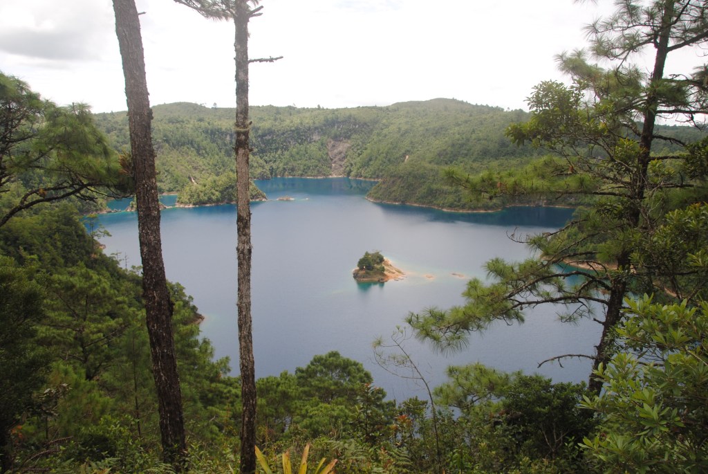 Là, nous empruntons le magnifique sentier qui s’élève sur la colline escarpée qui sépare le Pojol des Cinco Lagos, et offre de si belles perspectives sur les deux sublimes lacs. Nous arrivons sans mal au premier point de vue, d’où l’on peut admirer le Pojol, et la minuscule île paradisiaque qui flotte en son milieu. Le ciel s’est assombri, mais les couleurs, tenaces, résistent à la grisaille. De surprenants lézards à la queue turquoise nous tiennent compagnie pour ce joli moment contemplatif.