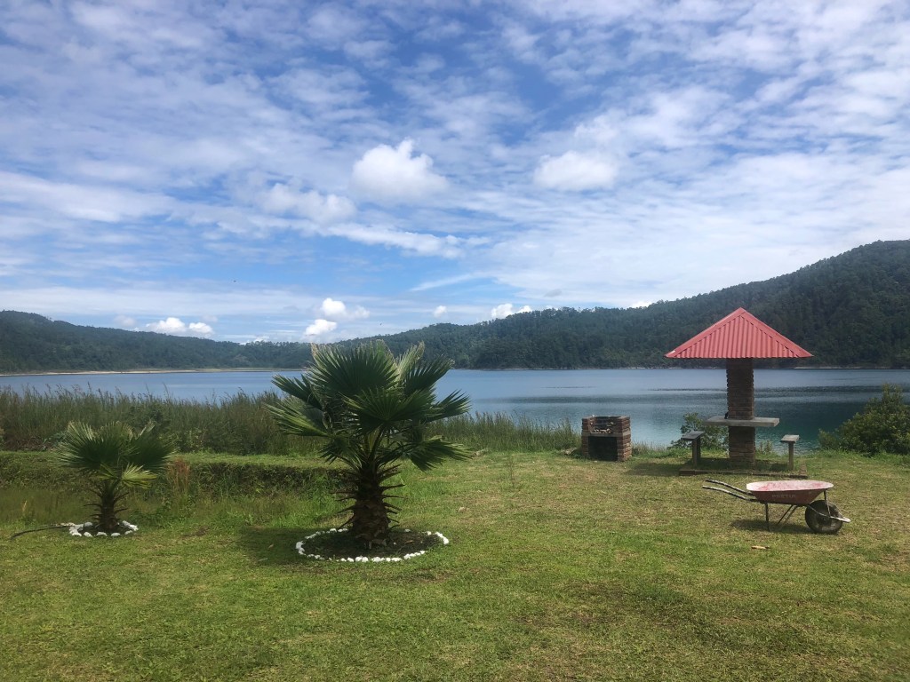 Dimanche matin, Tziscao. Il ne pleut pas. Sur la surface du lac se reflètent les nuages d’un ciel gris mais troué de taches bleues. De bonne augure donc pour la journée à venir. Nous petit-déjeunons en regardant le temps s’éclaircir au-dessus des collines de pins verts. En fin de matinée, il fait presque beau, et nous quittons donc les Cabañas Junkopal pour rejoindre, à pieds, le lac Pojol.