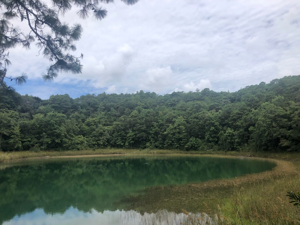 Avant de mettre le cap sur la ville, nous faisons étape entre les lagunes Esmeralda et Encantada, à l’autre bout du parc des Lagos de Montebello. Nous laissons nos bardas à une charmante dame à l’abri du « comedor », grand préau où se succèdent les stands de street food, et descendons le petit sentier menant aux deux lacs. Dans les conifères s’ébattent des orioles d’un jaune flamboyant, touches de couleurs vives dans un paysage beau mais terne. Sans lumière, les lagunes restent comme éteintes.