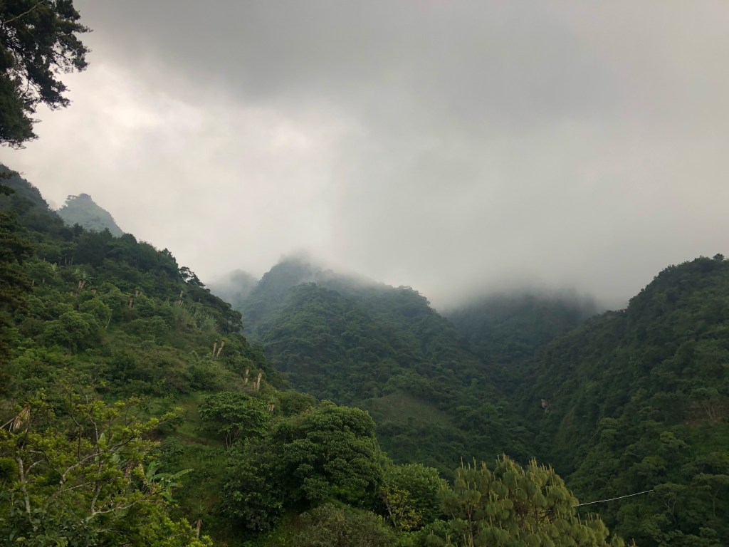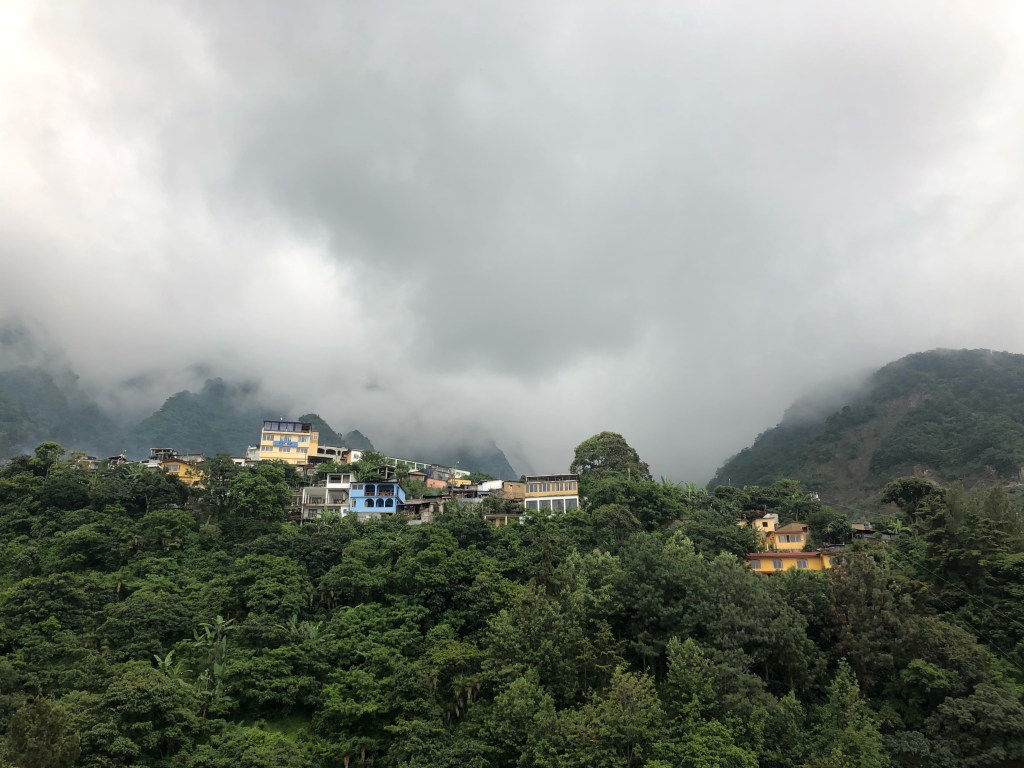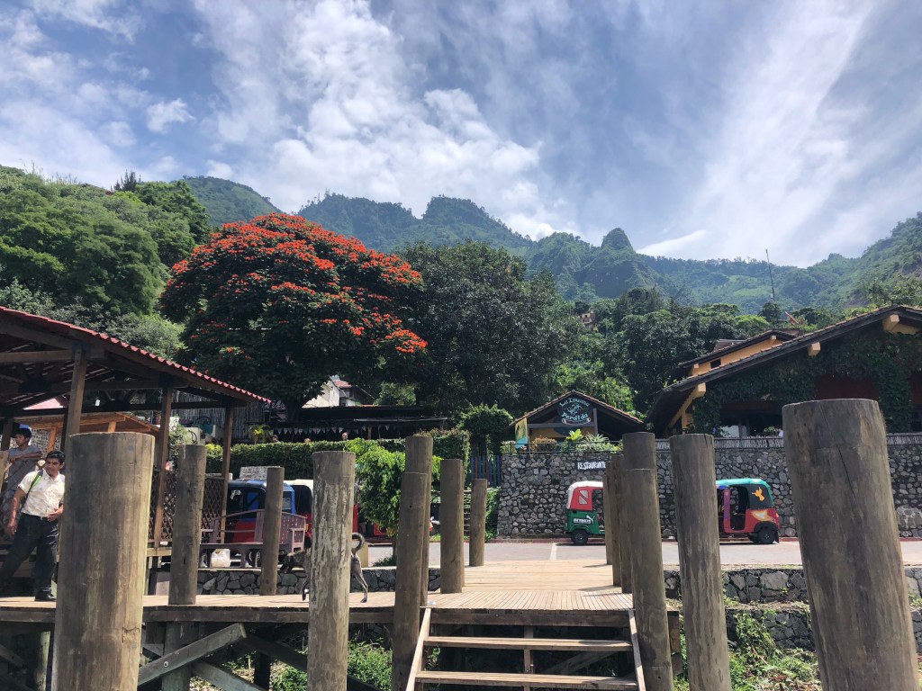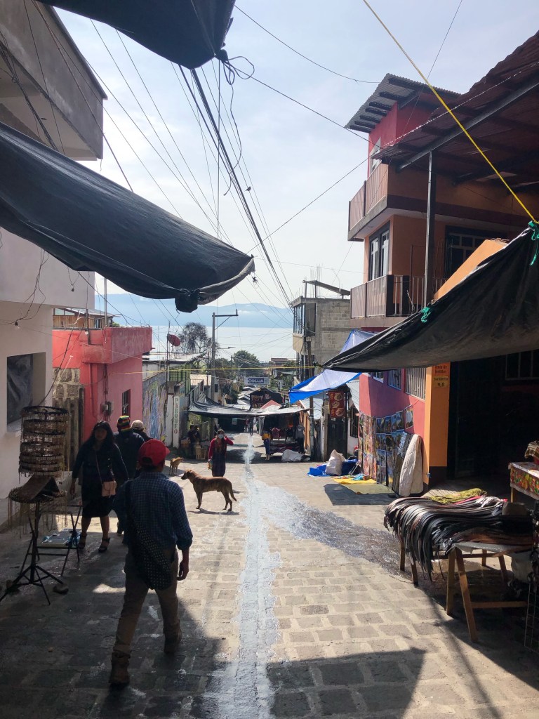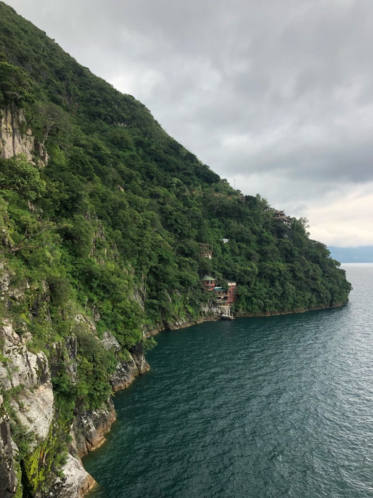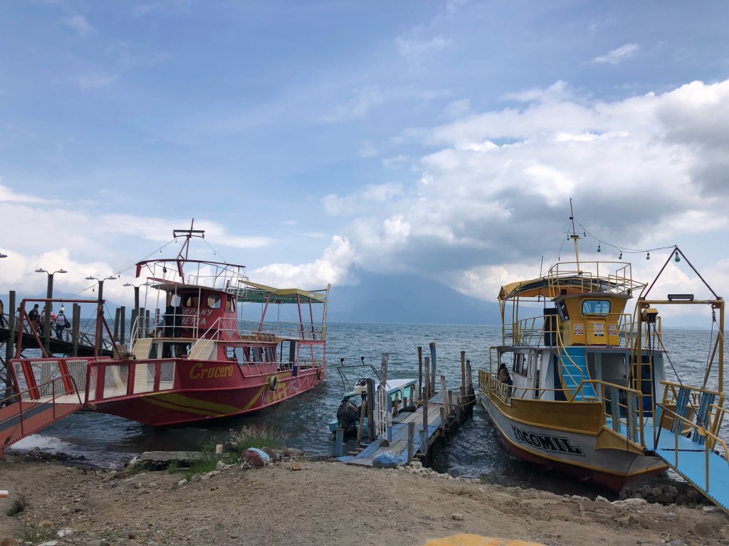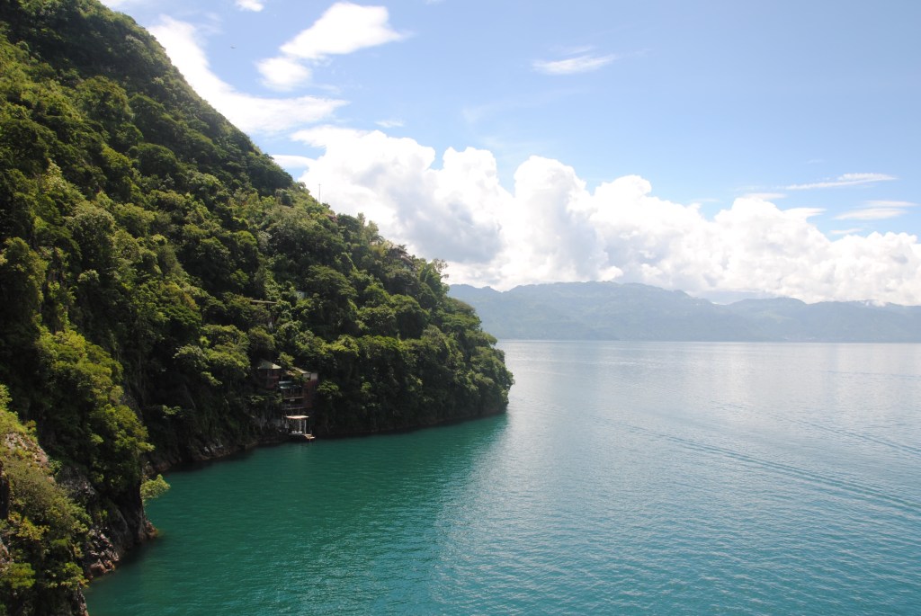 Vendredi matin, Xela. Matinée studieuse. Nous prenons le temps d’établir les grandes lignes du séjour sur les bords du lac Atitlan. À la mi-journée, nous prenons un chicken bus, puis un taxi, pour Panajachel. Avec les volcans dissimulés dans les nuages, le lac, entouré de vertes et abruptes montagnes, a des airs de lagune alpine. Quelques villages sont posés sur ses rives, ou perchés en surplomb. Mais l’endroit conserve un aspect sauvage et grandiose, pour notre plus grand bonheur.