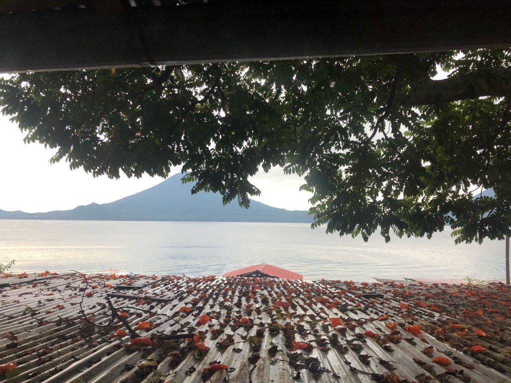 Nous sautons dans une lancha alors que tombent les premières gouttes de pluie journalières. L’embarcation nous dépose à Santa Cruz, où « la ville basse » se résume à un embarcadère et quelques maisons paisibles. L’une d’elle abrite l’Iguana perdida, notre auberge. Un personnel jeune et sympathique nous mène à notre vétuste chambre. Minuscule, sommaire, limite précaire, la cellule est dangereusement inclinée…Mais surtout elle dispose d’une vue imprenable sur le lac et le volcan Tolimàn ! Nous regardons tomber la pluie jusqu’à ce qu’elle cesse, laissant sa place à un étonnant et sublime couche de soleil. Sous un épais plafond gris, entre deux volcans, une bande de ciel orangée salue la fin du jour.