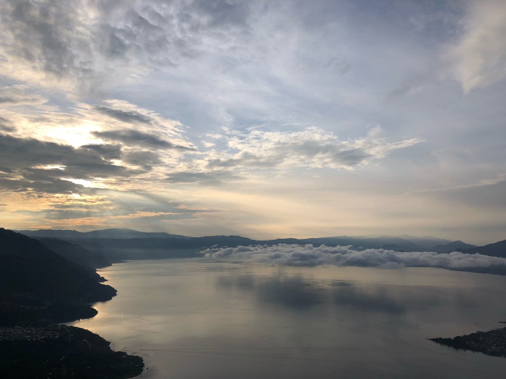 Mardi matin, San Pedro. Je suis réveillé depuis longtemps lorsque le réveil sonne, à 3h30, décalé par notre coucher si précoce. Mais un peu fatigué tout de même…Le minibus est à l’heure, et nous embarquons pour le pueblo perché de Santa Clara. Nous faisons halte à l’embarcadère pour récupérer d’autres touristes matinaux. Parmi eux, sans doute pour me rappeler que je n’ai pas beaucoup travaillé ma souplesse ces derniers temps, Lisa, ma prof de yoga d’Holbox, nos traces se croisant une nouvelle fois. Incroyable hasard ou manque d’originalité dans le choix de nos destinations, l’heure bien matinale nous évite le débat. Alors que le bus grimpe sur la route sinueuse de Santa Clara, la pluie commence à tomber. Et c’est sous l’averse que la troupe chemine sur le sentier boueux qui mène au sommet de l’Indian Nose, cette colline abrupte qui fait face au volcan San Pedro. Mais là encore la fortune nous sourit. Le temps que les sémillants gardiens de l’endroit nous préparent le café, la pluie cesse, et les nuages s’écartent afin de nous laisser voir le lac et l’horizon. Le ciel reste voilé, le soleil qui se lève perse à peine à travers la grisaille, mais la vue est dégagée, et c’est déjà bien. Et puis, les nuages qui flottent au-dessus d’une eau grise, et les lueurs orangées au dessus des montagnes donnent un aspect fantastique au paysage.