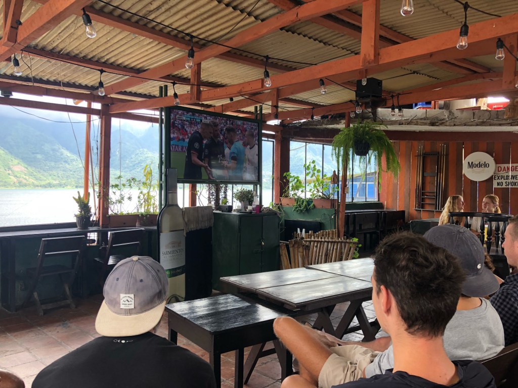 À la mi-journée, après une matinée plutôt tranquille, nous sautons dans la lancha pour San Pedro, au pied du volcan du même nom de l’autre côté du lac. Le village tranche avec le calme paisible de Santa Cruz…Crieurs en tous genres nous assaillent, et les abords de l’embarcadère sont bondés de touristes bruyants. Nous traversons ce petit Disneyland pour rejoindre notre hôtel de l’autre côté du pueblo. Le quartier est nettement plus calme, et, si quelques gringos circulent dans ces rues animées, ce sont surtout les locaux qui s’affairent ici. L’hôtel, simple et propre, dispose d’une vue splendide sur le lac et ses volcans ! Nous en profitons un court instant, puis retournons au centre touristique pour y régler les détails de nos excursions prochaines. Mais pas avant de regarder la seconde mi-temps d’un alléchant Belgique – Portugal, qui voit les diables rouges l’emporter à l’issue d’un match bataillé. Rendez-vous est pris dans ce même pub pour le huitième de finale des Bleus le lendemain !