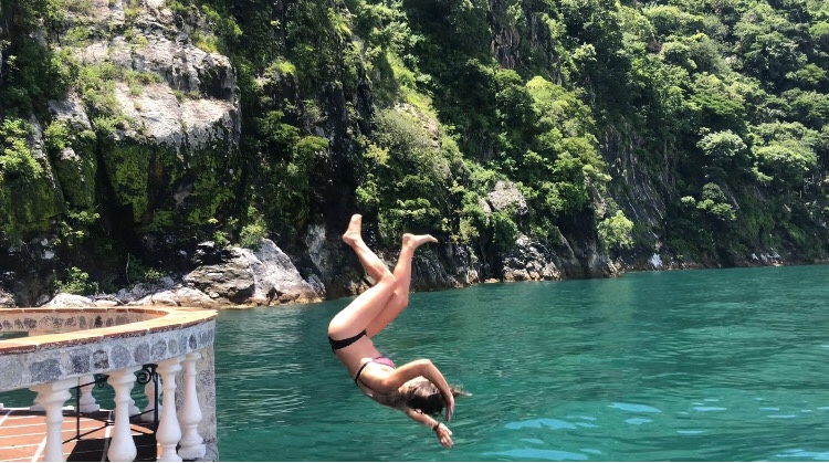 Il n’est que midi, mais la journée semble se poursuivre depuis une éternité. Et elle n’est pas terminée puisque nous embarquons dans la foulée du match pour…la Casa del Mundo, où nous avons finalement trouvé une chambre. Perturbée par les eaux agitées du lac, la lancha nous jette quasiment sur le ponton, Arlette manquant de tomber par dessus bord. Mais la suite du séjour se veut beaucoup plus douce. Le lieu est fantastique ! Des escaliers richement fleuris mènent à d’innombrables terrasses de pierre au charme méditerranéen. Les bâtiments de pierre aux toits rouges semblent sorti du promontoire, ne faisant qu’un avec la roche. L’accueil est professionnel et chaleureux, et le gentil réceptionniste nous annonce que nous avons été upgradé. Première d’une longue série de surprises. Nous investissons nos quartiers, admirant longuement la vue magnifique depuis nos grandes fenêtres. Puis nous courrons nous jeter dans les eaux limpides de la lagune. La terrasse et ses jolis rebords, ainsi que la profondeur du lac, sont propices au jeu. Nous improvisons ainsi un atelier de saltos arrières, ponctués de plats retentissants, mais surtout de rires francs et massifs. Pour soigner nos corps d’athlètes après ces prouesses, nous nous offrons un sauna régénérant, avant de retourner nous égayer dans les vagues. Un moment génial !