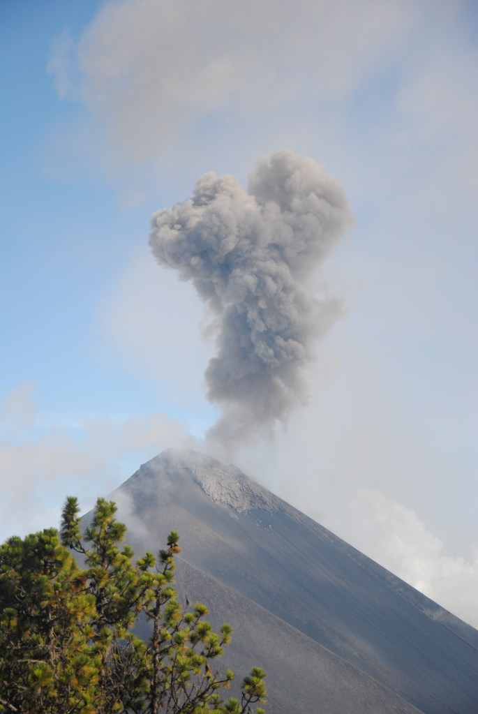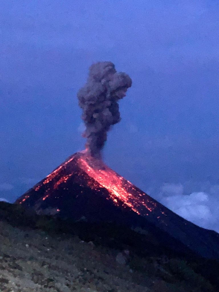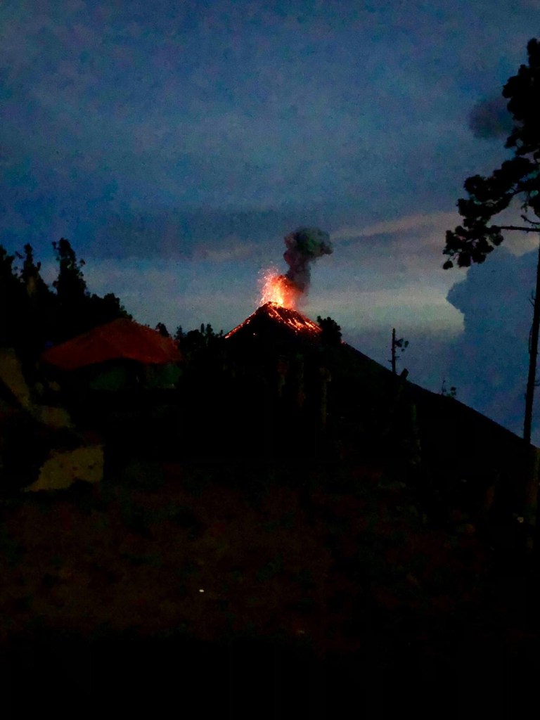 Puis, alors que nous débarrassons la table, sur la terrasse, une tache rouge trouble le bleu sombre de la nuit. El Fuego est en pleine éruption, et crache des roches incandescentes rouge flamme qui roulent ensuite sur ses flancs. Incroyable ! Émus, nous restons un moment, assis silencieusement à regarder les explosions successives du volcan. Seule la volonté d’être en forme pour rejoindre le lendemain le premier rang de ce formidable spectacle nous fait quitter notre balcon…