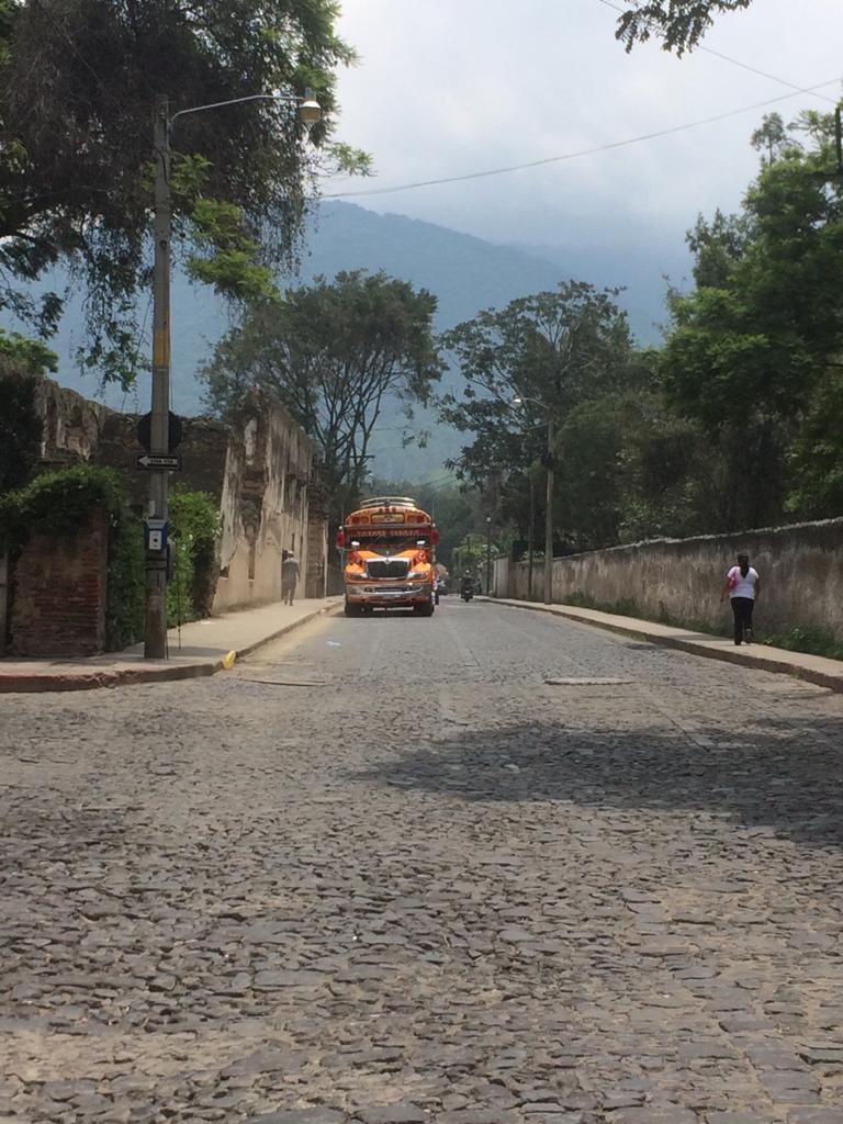 Nous récupérons nos backpacks à l’hôtel Amigo, puis grimpons dans un chicken bus. Débute alors un périple de 4h30, qui nous voit prendre quatre bus scolaires différents pour parcourir les 80 kilomètres qui nous séparent d’Antigua…Et ce malgré les transitions ultra-efficaces entre les différentes chariotes ! À fond dans les virages, alors que nous nous accrochons durement à nos sièges pour ne pas passer par dessus bord, l’assistant du chauffeur, en pleine marche, grimpe sur le toit pour ajuster les bagages…Des grands malades !
