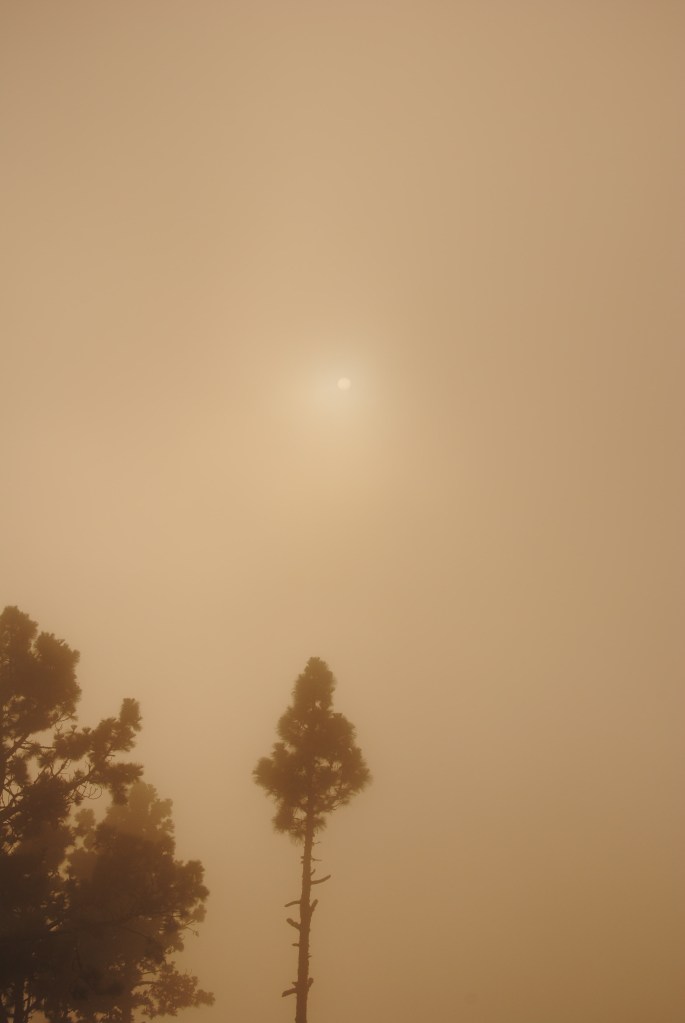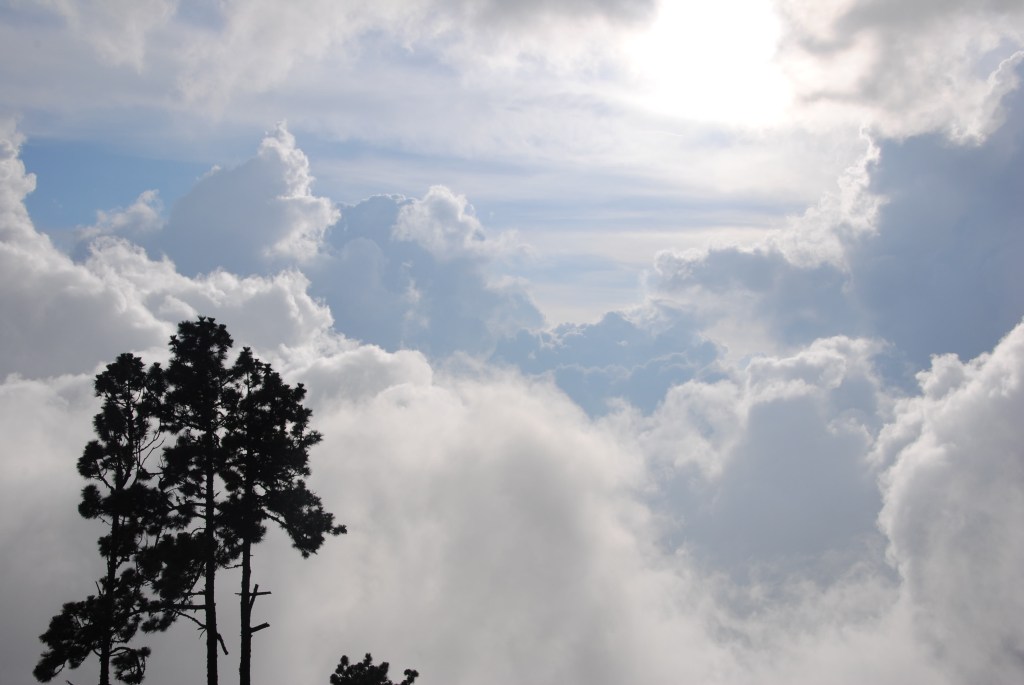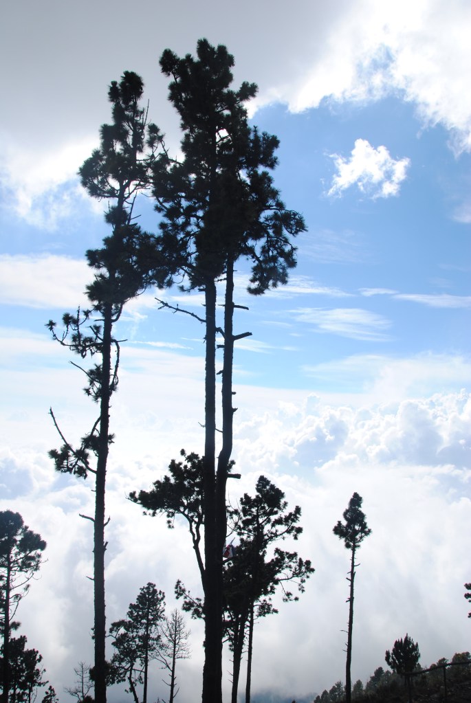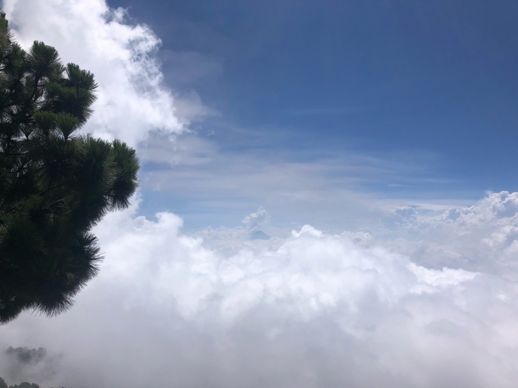 La marche se poursuit ainsi, nous marchons dix minutes puis attendons le double que ces dames atteignent le check point, à une allure d’escargot paraplégique. Nous serions presque gagnés d’impatience, si le paysage n’était pas aussi beau. La forêt de nuages d’abord, avec ses arbres recouverts de mousse qui donnent un aspect inquiétant et magique à ces bois. Puis les hauts pins noirs, et la végétation moins dense qui laisse apercevoir le sommet de l’Agua qui perce les nuages.