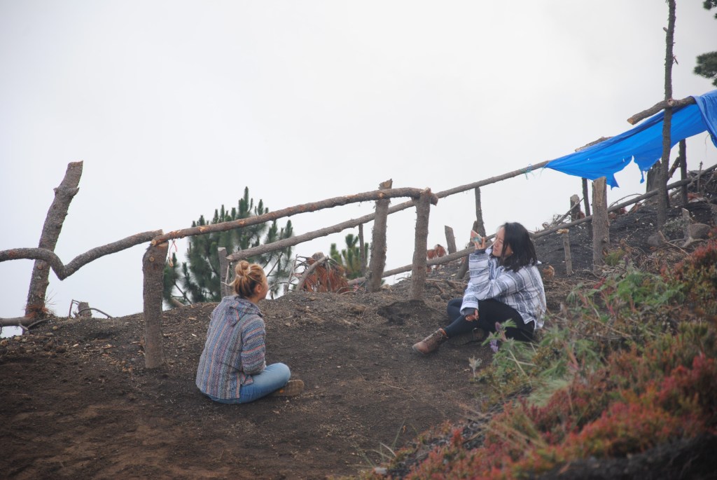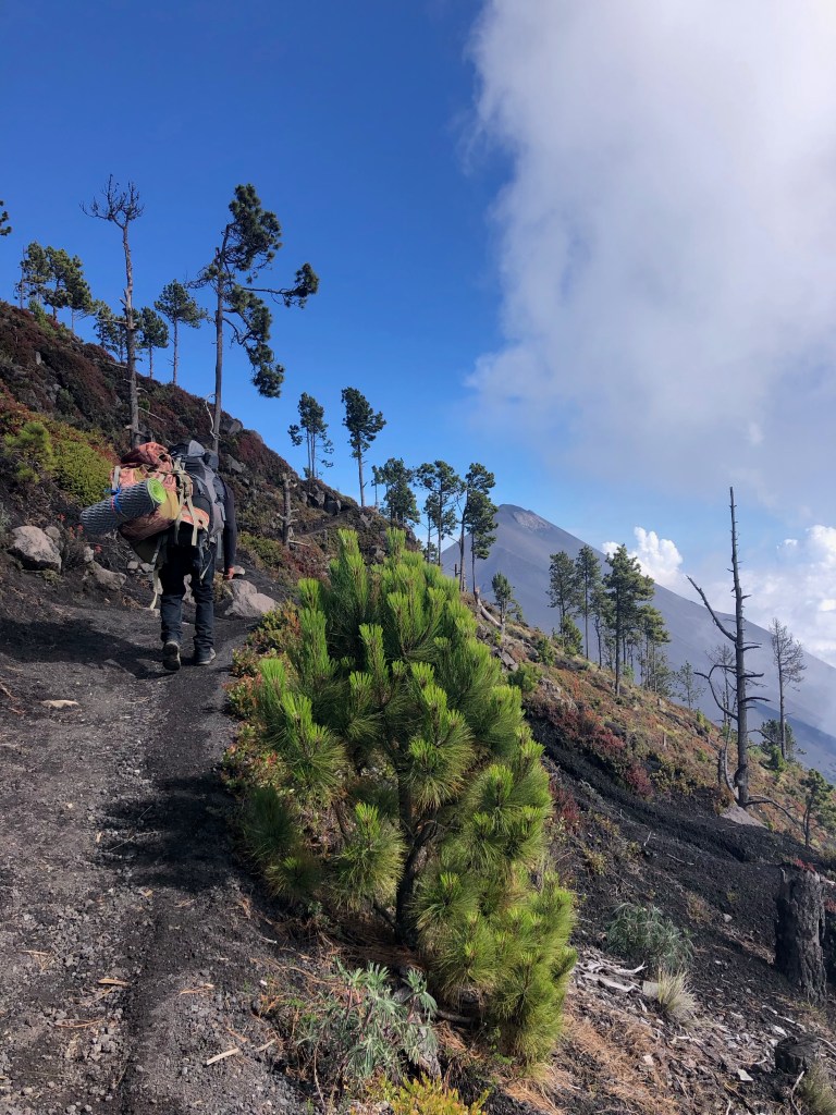 Samedi matin, Maison Bougainvillea. 7h30, nous montons dans le van qui nous emmène au point de départ de notre randonnée. Nous découvrons nos équipiers : Colleen et Patrick, couple trentenaire de l’Ohio exilés en Floride, et Anolia et Lilly, deux étudiantes de Chicago. Les premiers semblent rompus aux voyages et à l’aventure. Les secondes nettement moins, d’avantage Snapchat que Décathlon. Prometteur…Nous arrivons au « camp de base » une bonne heure plus tard, et le « jefe » nous briefe sur les deux jours à venir. Il nous présente Rufino, notre guide, sourire malicieux sur un visage anguleux, et physique de grimpeur, maigre et nerveux. Matelas ficelé et déjeuner calé dans nos sacs à dos, nous sommes prêts. Le sentier s’engage à travers champs, et nous voyons distinctement le profond sillon creusé par la pluie en son milieu. Pourvu que nous arrivions avant elle au campement ! Très vite, nous croisons les aventuriers ayant fait l’ascension la veille. Visages fatigués mais sourires jusqu’aux oreilles, leur message est clair : c’est dur, mais ça en vaut la peine ! Boostés par leurs encouragements, notre foulée redouble de vigueur. Mais nous réalisons bien vite que le reste de la troupe peine. Pas Colleen et Patrick, qui nous rejoignent bien vite. Mais les deux college-girls peinent à mettre un pied devant l’autre. Nous sommes partis depuis 15 minutes et devons déjà les attendre un gros quart d’heure. La journée promet d’être longue…L’une d’elle a déjà refourgué son sac à Rufino !